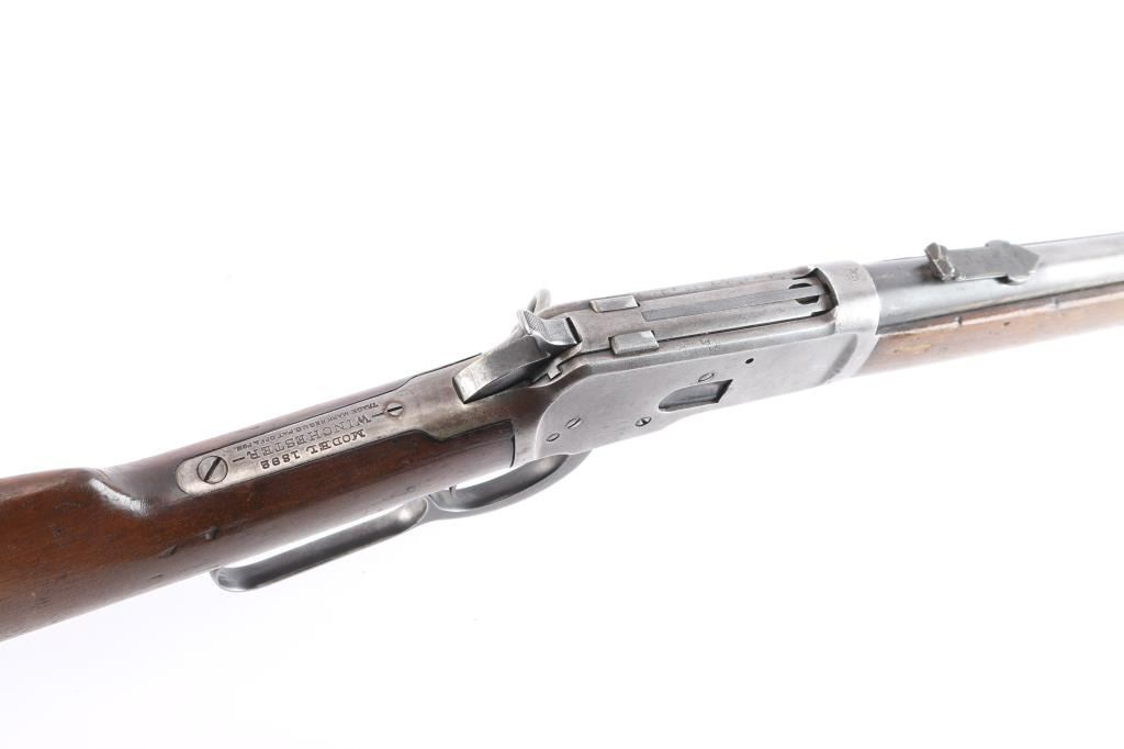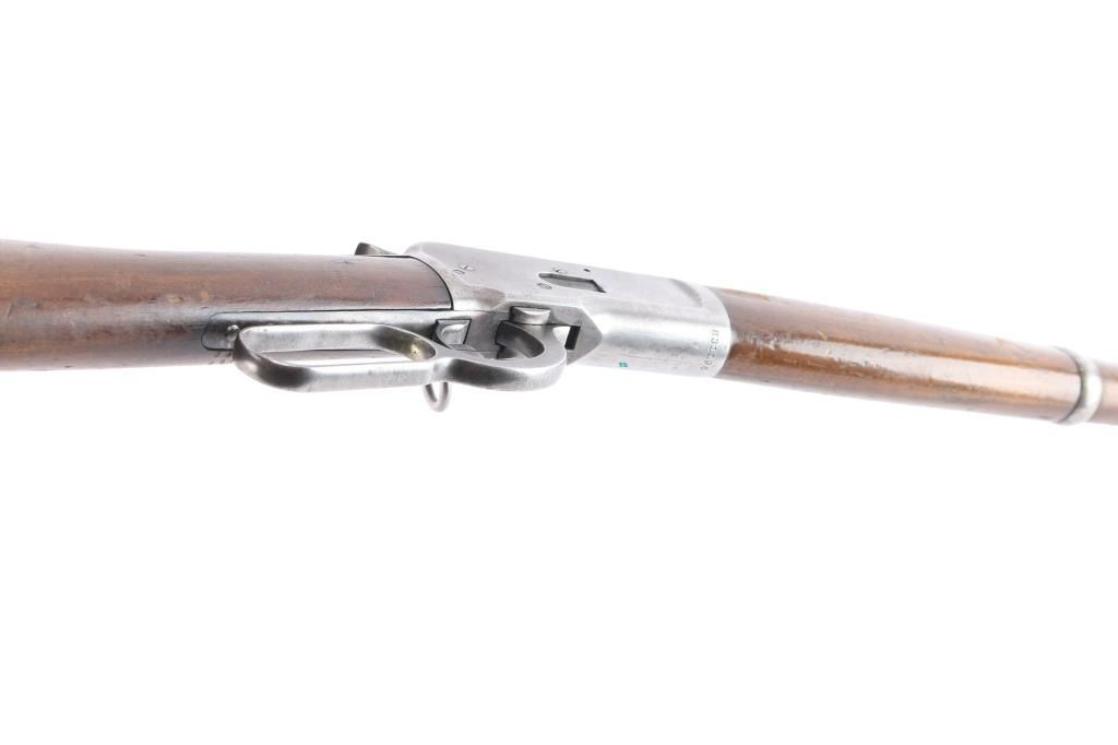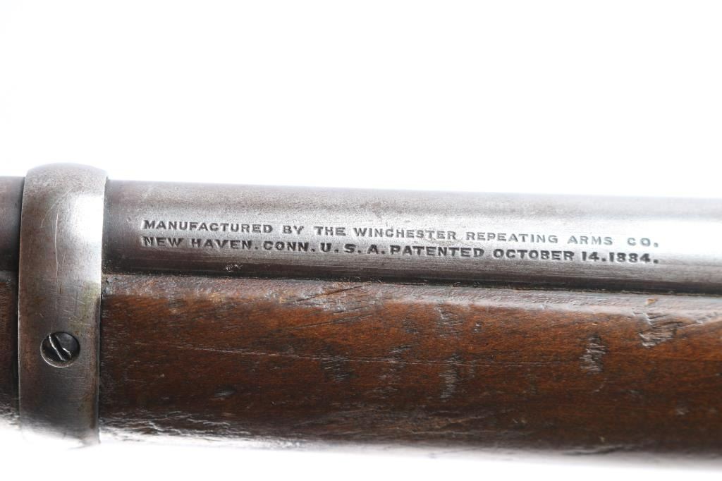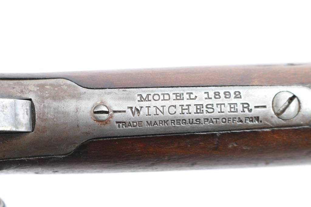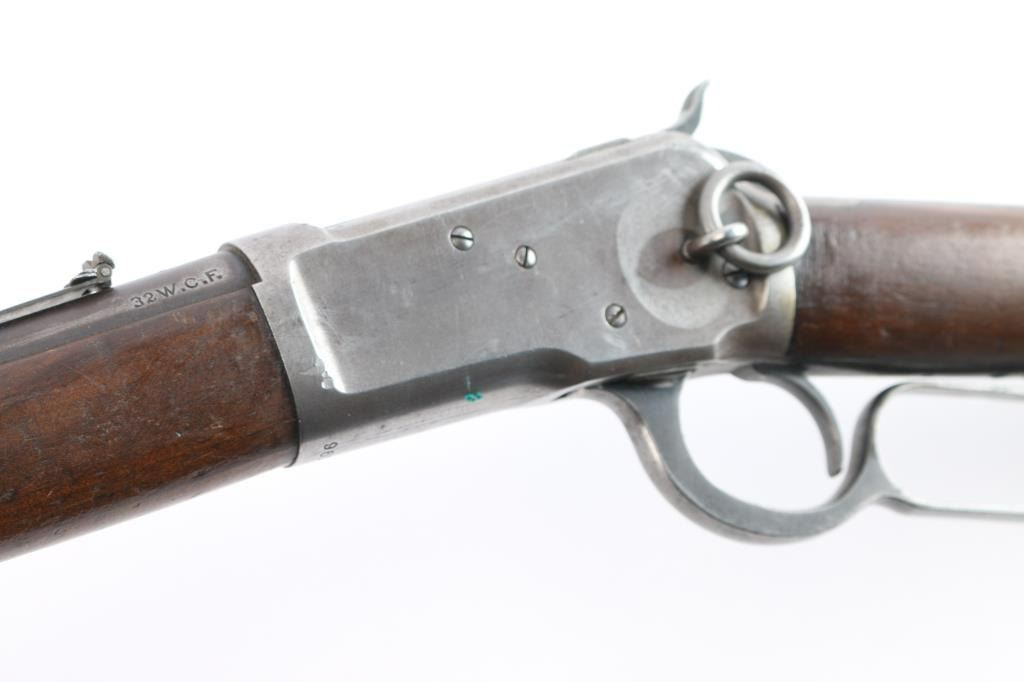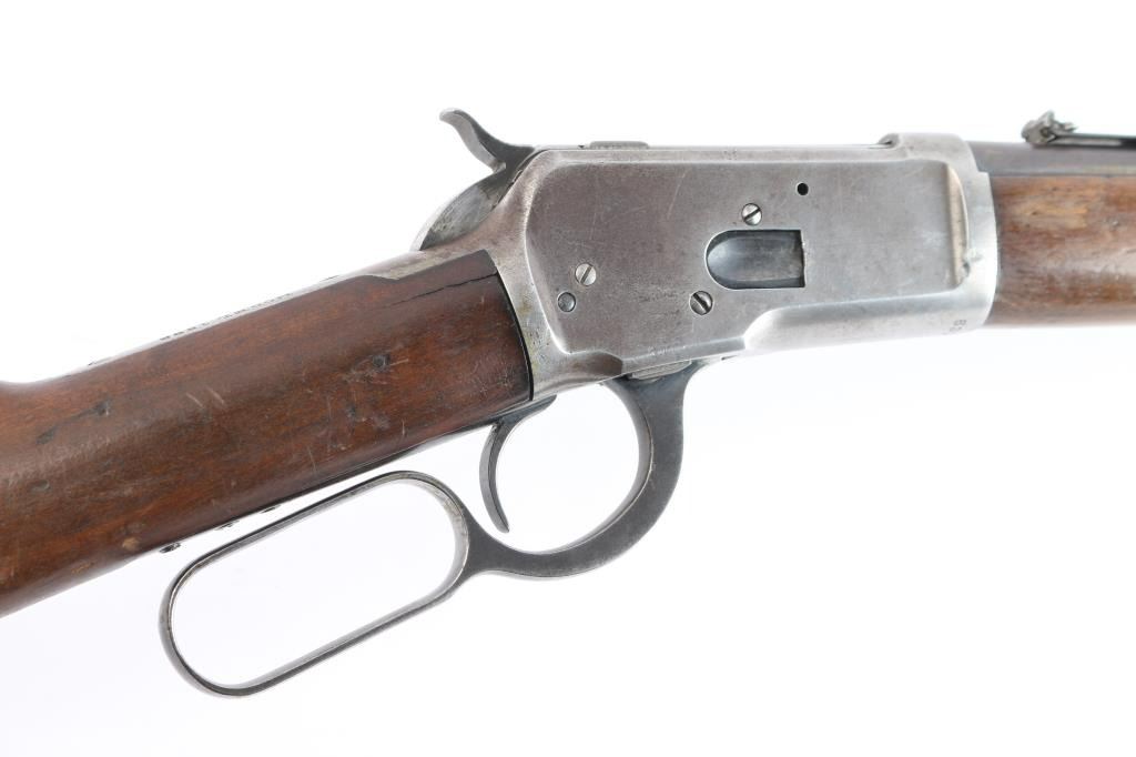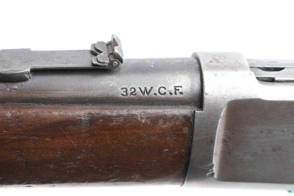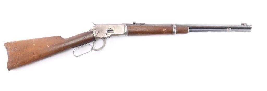 Winchester 1892 S.R.C. 32-20 caliber. This carbine remains in good to very good condition with 20-40 percent original blue on barrel and magazine with balance drifting to gray patina. Markings and address are good. 3 leaf folding Winchester rear sight and large blade/bead front in proper positions. Stocks are good with numerous dings, mars and scratches. Action good, bore fair but may scrub up to good. Manufactured 1916.