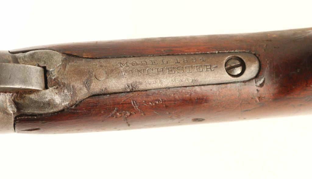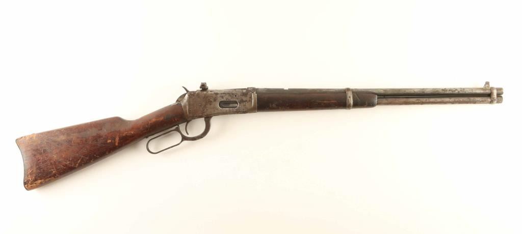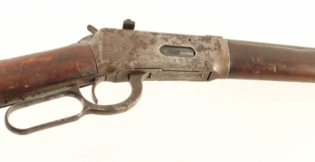 Lever action rifle manufactured circa 1908. Features blued finish, plain wood forend & straight grip stock, curved steel butt plate, 20" barrel, full length magazine tube, blade front sight, rear sight missing, receiver peep sight. Bore is poor to fair condition, frosted and lightly pitted, slightly eroded rifling, small darker areas appear rusted. Metal surfaces show large areas of patina or pitting, areas of cleaned moderate pitting, have a mottled gray or brown color. Wood is fair serviceable condition, with deep scratches and nicks, some gouges, and patches of bare wood. Left side appears to have the base for a saddle ring screw mounted, filed flat and close to flush, leaving a large round head present. Front sight and top tang both have heavy weld or solder repairs, with large amounts of added material present. Condition is NRA Poor *** C&R Firearm ***