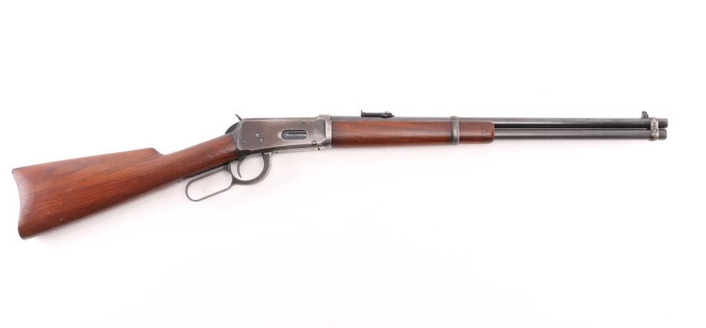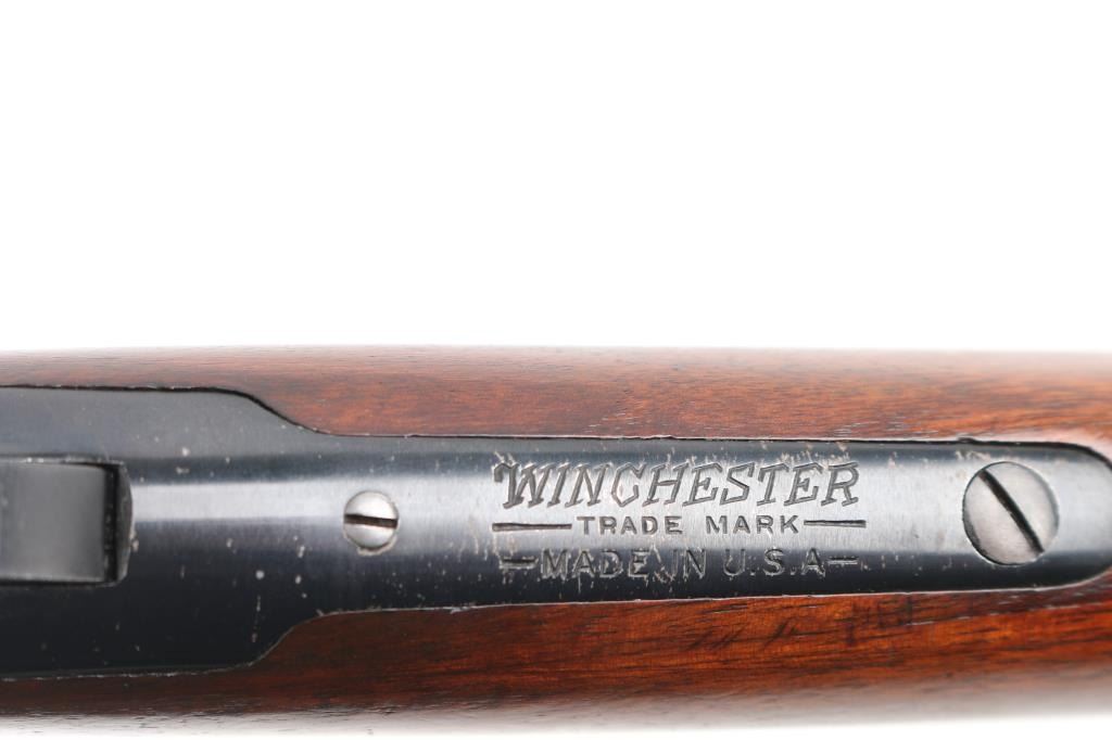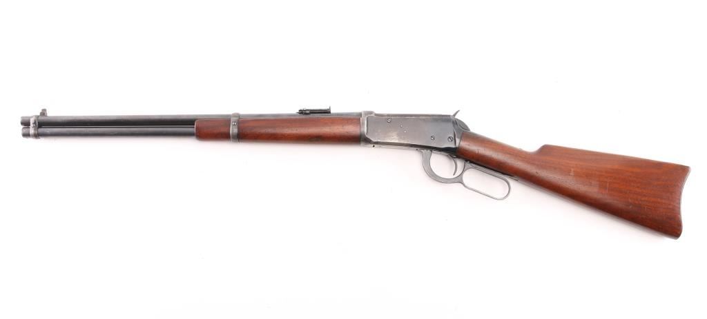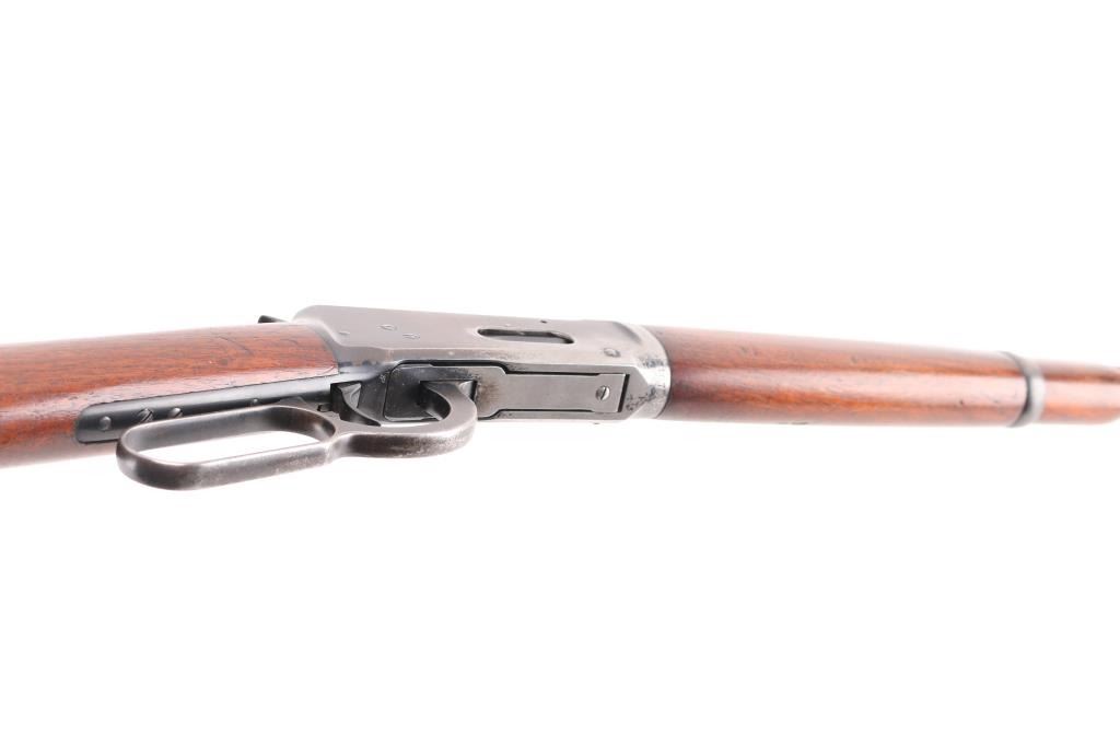 'Pre-64 Eastern Carbine' Lever action repeating rifle manufactured in New Haven, CT circa 1928. Features a blued finish, 20" tapered barrel, full-length tube magazine, pinned blade front sight, adjustable ladder rear sight, smooth trigger, knurled hammer spur, two barrel bands, smooth walnut forend and straight grip shoulder stock with carbine steel buttplate. Bore is excellent condition, bright, strong rifling. Retains about 65% finish with edge losses, scratches, handling wear, mostly to the receiver. The receiver also has some very light, scattered areas of pin-prick pitting. Wood is very good condition with minor scratches/dings. Action is smooth. NRA Condition-Good. C&R Firearm.