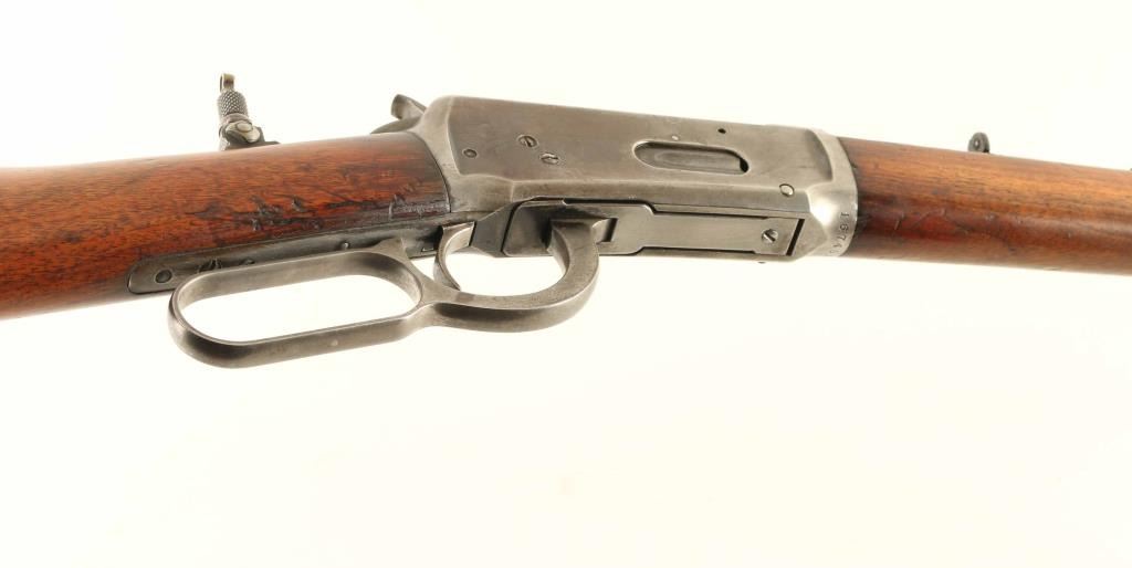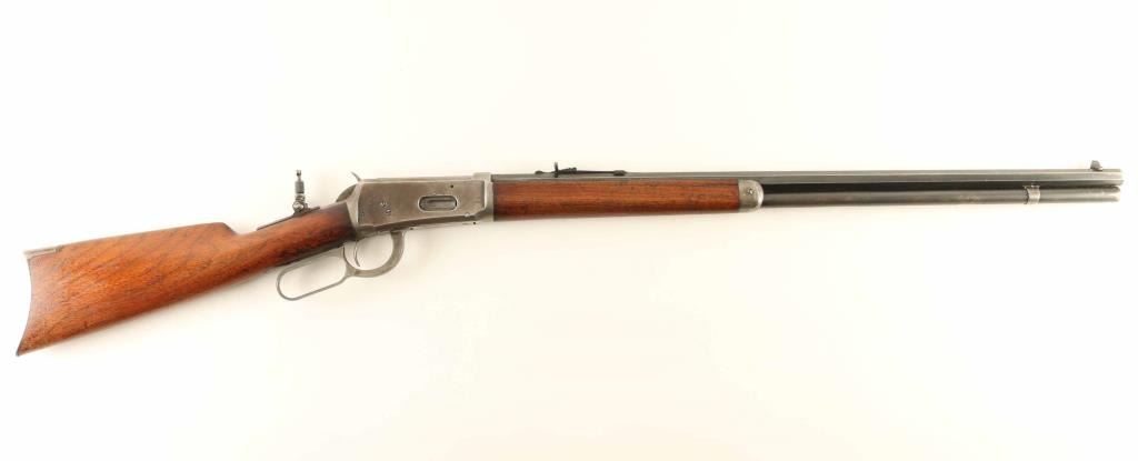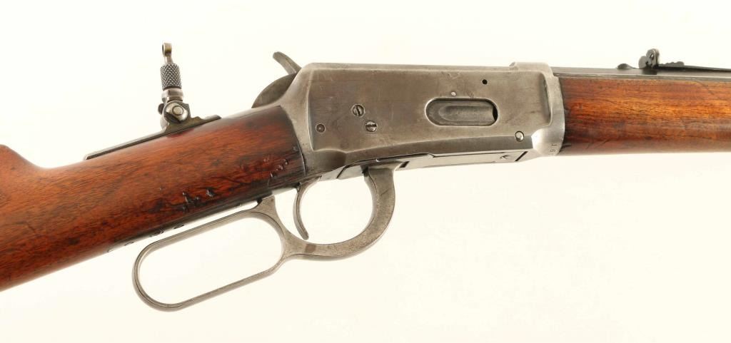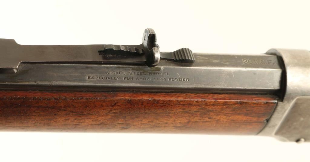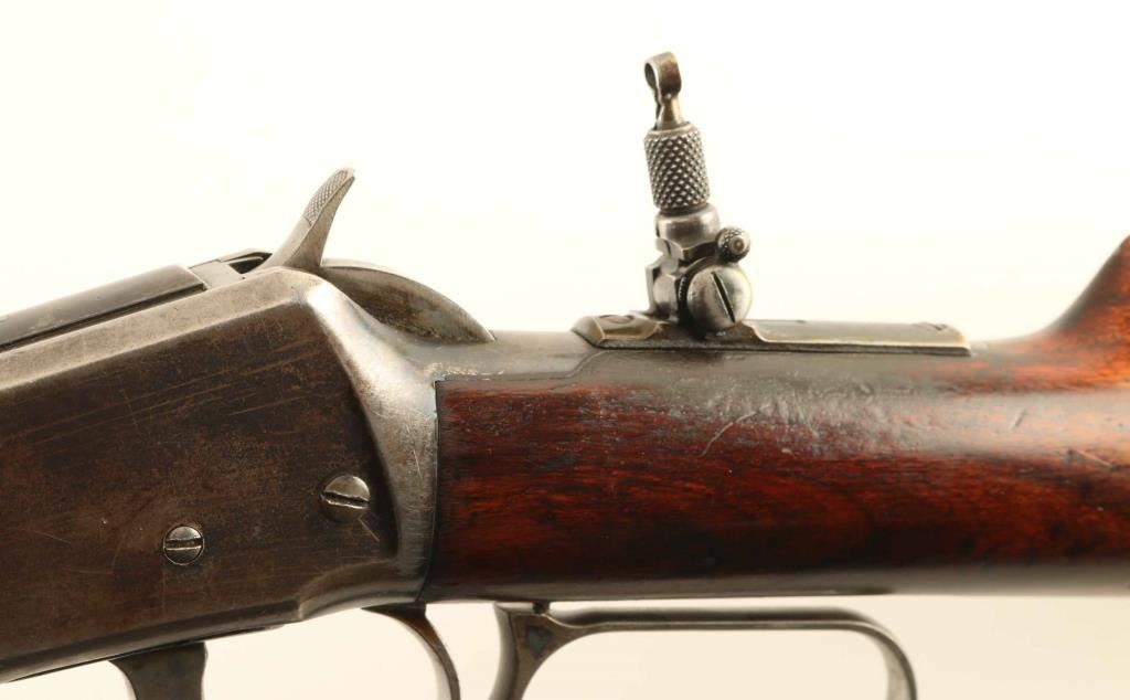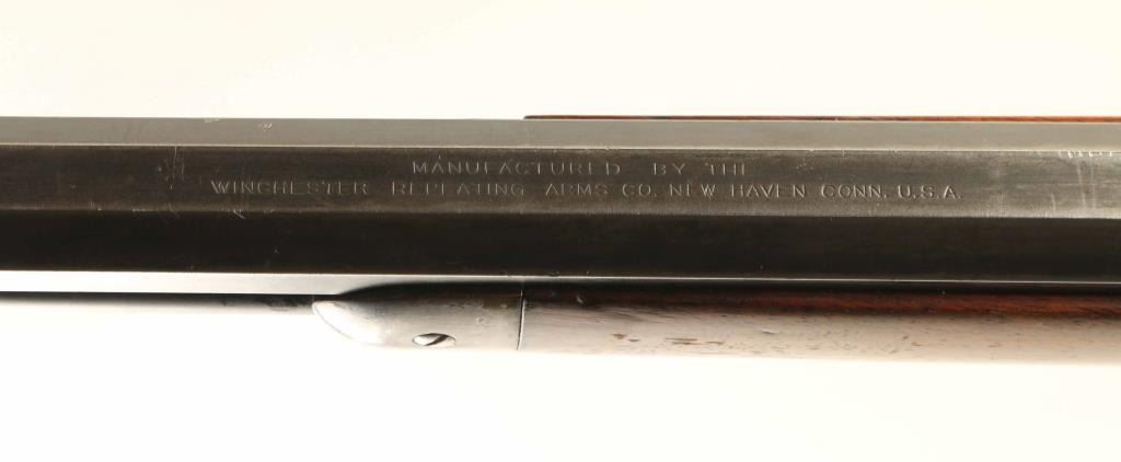 'Sporting Rifle' manufactured circa 1899. Features 26" octagon barrel, full length magazine tube, buckhorn sights, Lyman tang sight, straight grip, steel crescent buttplate. Bore is fair condition, frosted & slightly dark with strong rifling. Metal surfaces retain 60% blued finish, thinning or showing bare metal at edges of barrel flats, several places on magazine tube, forward sections of receiver. Nicks, dents & scratches to edges of barrel and sides of receiver, on mag tube. Mag tube has marks on forward section that appear to be tool marks. Forend cap is gray color bare metal. Buttplate is mostly smooth bare metal, with scattered light patina. Screw slots typically fair condition with some marring. Forend is fair to good condition, some dents & scratches, long crack on right side below upper edge, good fit to metal. Butt is good condition with creases and dents, staining at wrist, good fit to metal, very little shrinkage noted. Markings are mostly deep and clear, with even depth. Action operates smoothly. Condition is NRA Good *** C&R Firearm ***