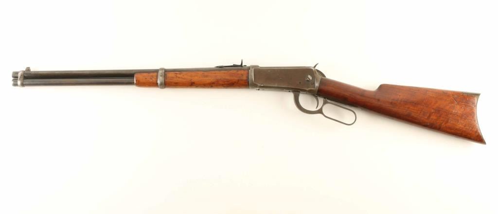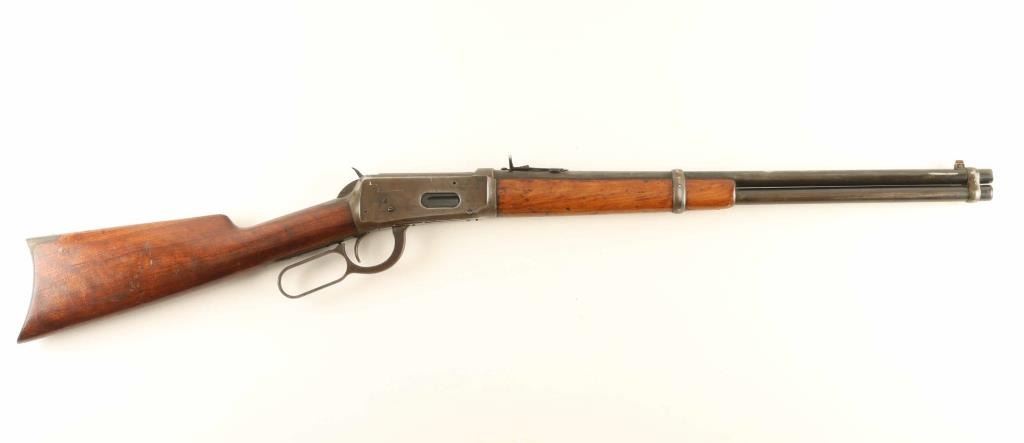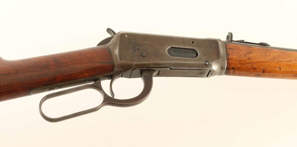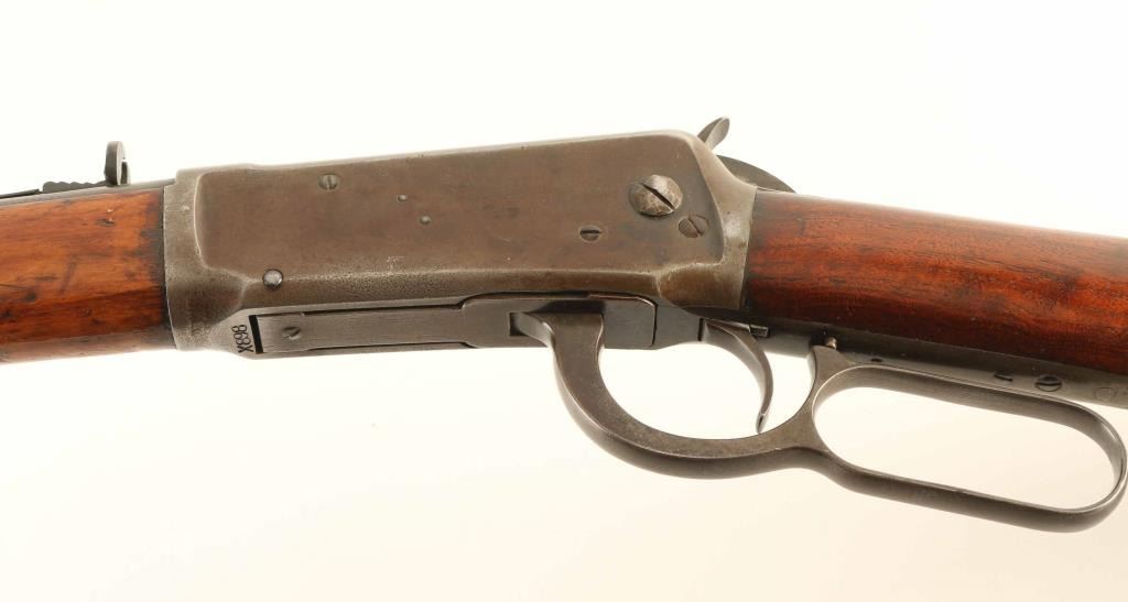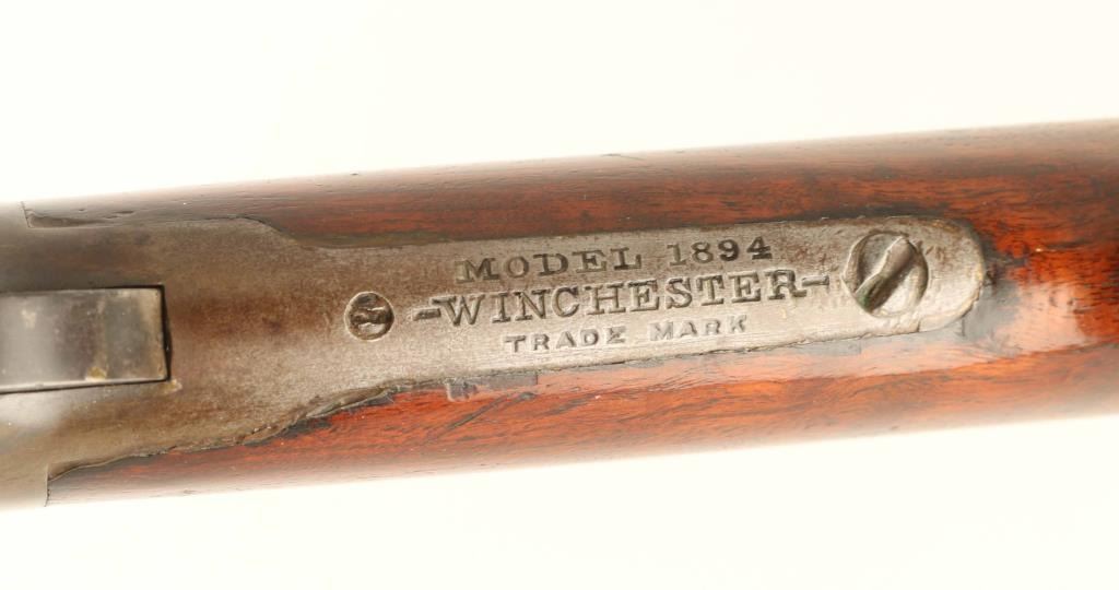 Lever action rifle features blued finish, straight gripped two piece stock with steel crescent buttplate, 20" barrel, full length tube magazine, buckhorn sights. Bore is dark with strong rifling, areas of visible pitting. Retains 60% coverage of thinning blue, turning brown, darker in recesses. Bands, edges of receiver are light gray in color. Most metal surfaces display fine pits. Bare metal shows at scratches on receiver, some sharp edges. Large head screw on left side of receiver appears to be a non factory replacement. Many screw heads have marring to slots. Forend appears lightly sanded, with deeper dents still showing as a darker color, good condition with goo band fit. Stock displays feather grain, many small dents, good serviceable condition. Markings are crisp, even depth, two line barrel address good with several letters obscured by dents. Condition is NRA Good *** C&R Firearm ***