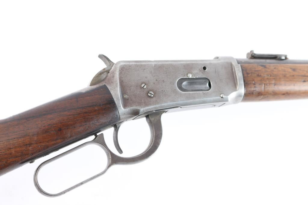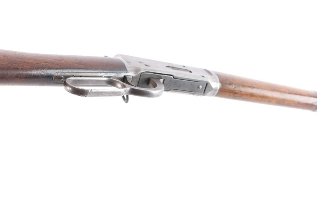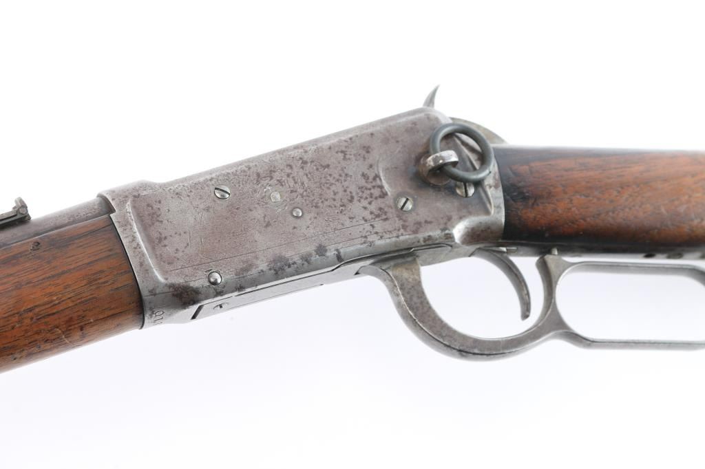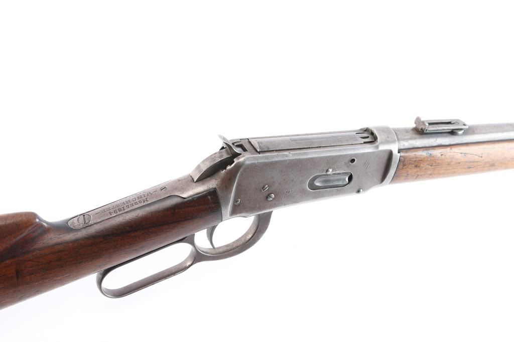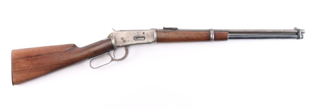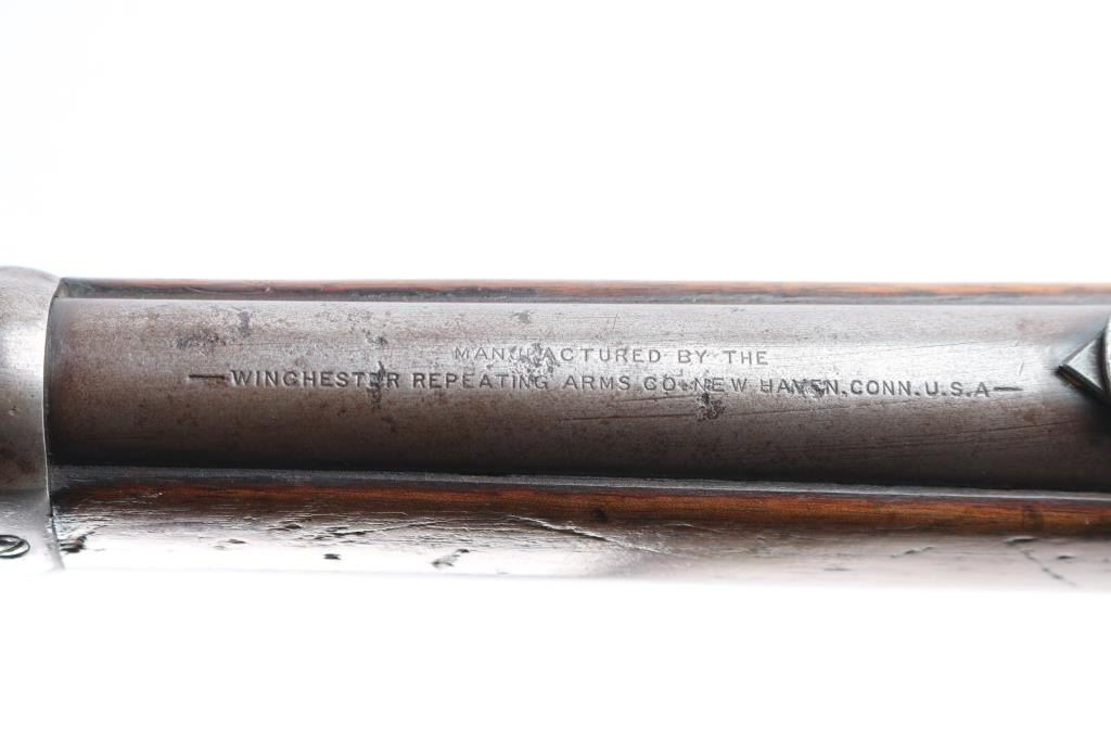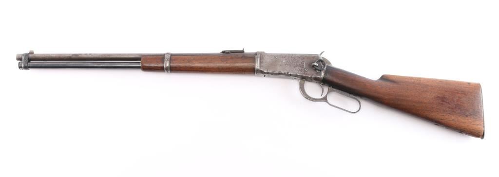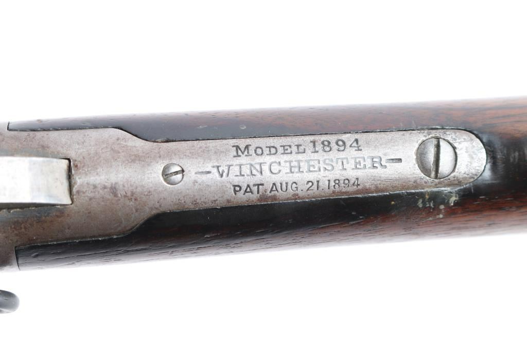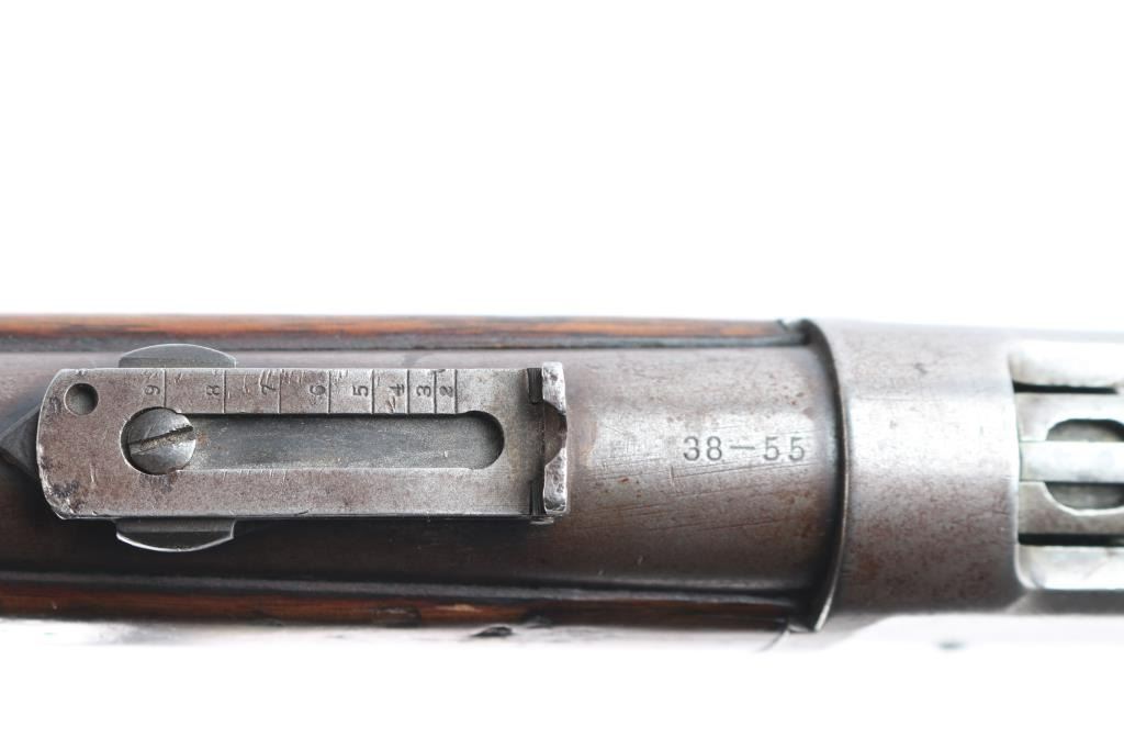 Desirable Winchester 1894 carbine in 38-55 caliber. Magazine tube, saddle ring and butt stock later replacements. Patina finish with minor erosion and pitting. Good markings, good action, fair bore. The stock is later production Winchester with milled steel buttplate. The buttplate is proud of the stock, there are 3 holes in the lower underside of the buttstock for sling stud. Manufactured 1900.