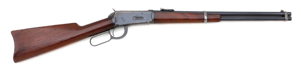 serial #144293, 32-40, 20'' barrel with full magazine and a bright very good bore showing light oxidation and strong rifling throughout. The barrel and magazine tube retain perhaps 90-95% original blue with areas thinning to brown with light handling marks and spots of oxidation staining. The receiver retains about 75-80% original blue toning brown under bright light with light handling marks, high edge and carry wear. The hammer, lever and trigger are mostly a mottled gray patina with remnants of case-hardened colors and the barrel bands have a dull pewter patina. The smooth gumwood stocks rate very good with expected light handling marks and has a vacant hole in the toe line where a swivel stud once was. The rifle has a Marbles blade front sight and ladder rear sight and the saddle ring is intact. A very handsome 1902 manufactured carbine. (10A11762-2) {C&R} (1800/2200)