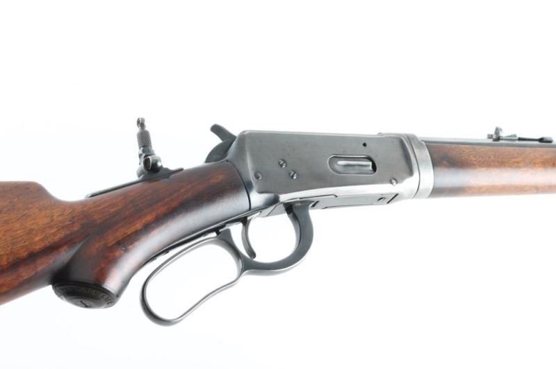 SN: 101444 Factory 'Extra Light' rifle manufactured circa 1901. Features blued finish, smooth walnut forend & curved grip stock, 26" half round half octagon barrel, half length magazine tube, plain trigger, Marble's sights (dovetailed blade front sight on elevated base, sporting rear sight mid-barrel, tang mounted peep rear sight), shotgun butt with factory composition buttplate & grip cap. Bore is good condition with strong rifling, some darkness in grooves. Retains 60% blued finish with edge losses, bare metal on barrel over breach & forward portion of receiver & takedown block. Some areas show thinning or graying to finish. Wood is good condition, oil stained where wood touches metal, slightly proud of buttplate at toe, fair match to curve of lower tang. Included factory letter confirms takedown, caliber, barrel & trigger type, butt type. Letter indicates original as-shipped configuration includes Lyman sights (now mounts Marble's), checkered stock (now smooth). Condition is NRA Very Good *** C&R Firearm *** [From the Jim Sigmon Collection]