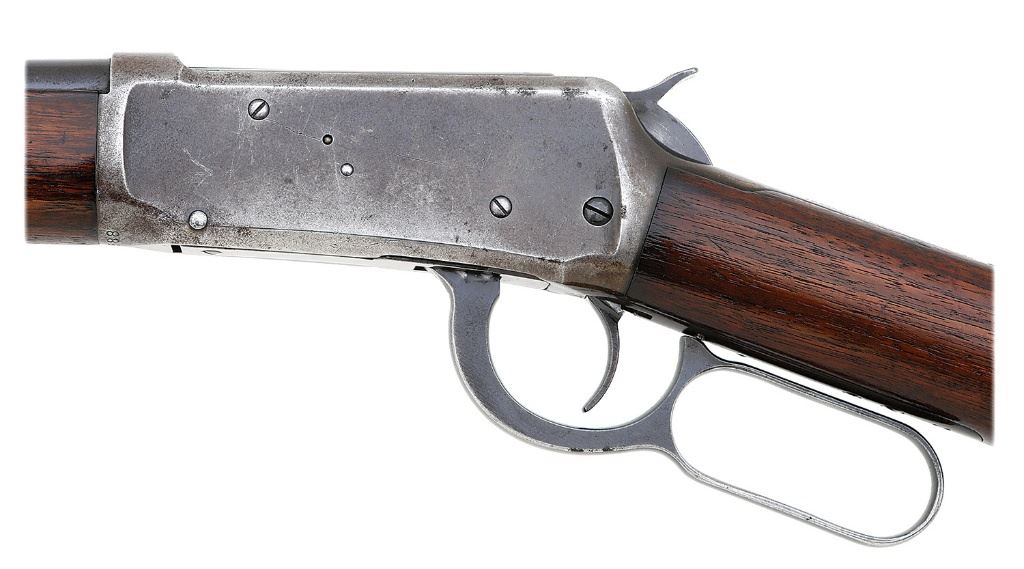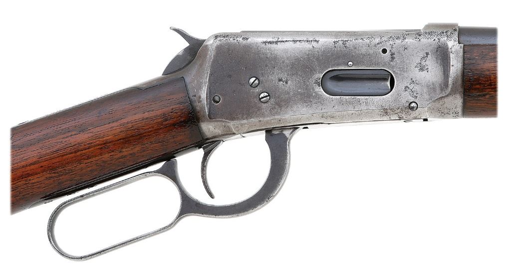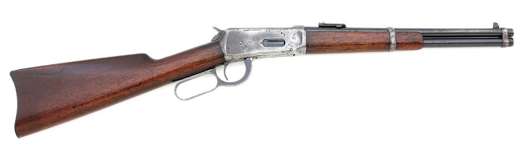 serial #894588, 32-40, 15" barrel with an excellent bore. This carbine is ATF exempted by serial number and appears on the curios and relics list as being removed from the provisions of the NFA and classified as a curio & relic. The carbine remains in nice honest condition with the barrel and magazine retaining about 50% original blue finish blending with a pleasing smooth brown patina overall. The action shows a pleasing smooth gray brown patina with finish flaked in some areas and worn in others. The action shows some scattered patches of light pitting on the right side of the action likely from a right handed person carrying the gun by the action. Most screwheads remain untouched and the carbine has a very honest appearance. The plain walnut buttstock and forend rate very good retaining lots of original finish with some bruises and handling marks we would expect to see on a working gun like this. The gun is equipped with original Winchester carbine sights. A very solid and very honest 94 Trapper carbine for the Winchester collector. (1D11716-12) {C&R} (7000/9000)