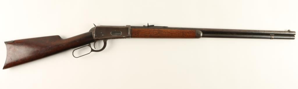 Winchester Model 1894 lever action rifle, .38-55 caliber, 26” round barrel, S/N 349367, blued finish, wood stocks in overall very good condition displaying a plum brown patina mixed with considerable original blue on metal surfaces, very good bore, crisp action, and markings, good wood stocks with butt stock showing scattered old mars and scratches from carry and storage. (C&R). Est.: $1,250-$2,500.