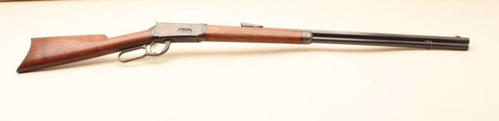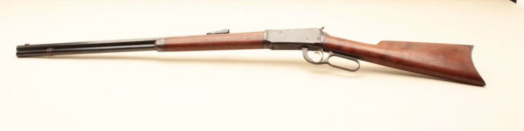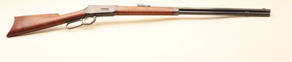26” octagon barrel, full mag, rifle butt, S/N 174677 in very good plus to near fine condition. 80%-90% evenly thinning and toning blue finish with losses at the high point and edges with just minor normal aging. Good markings and original .32 Winchester special “Smokeless” rear sight retained. The frame shows 70%-80% evenly drifting and toning blue finish. Some scattered surface erosion that is very minor. Good original case hardening on the hammer and lever which at least 0.5 remains. The stocks are very good plus to almost fine with minor marks and dents. The butt plate shows some dents and mars along with some coloring added. The action is good and tight. The bore is good to very good and would improve with cleaning. A nice 94 rifle for 100 years of age. (C&R) Est.: $700-$1400
