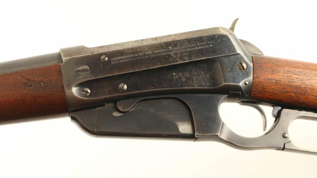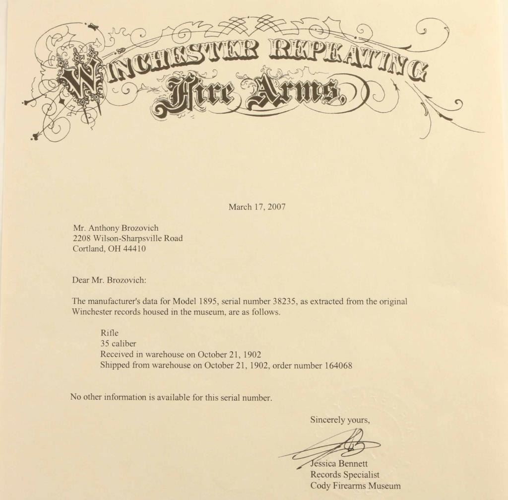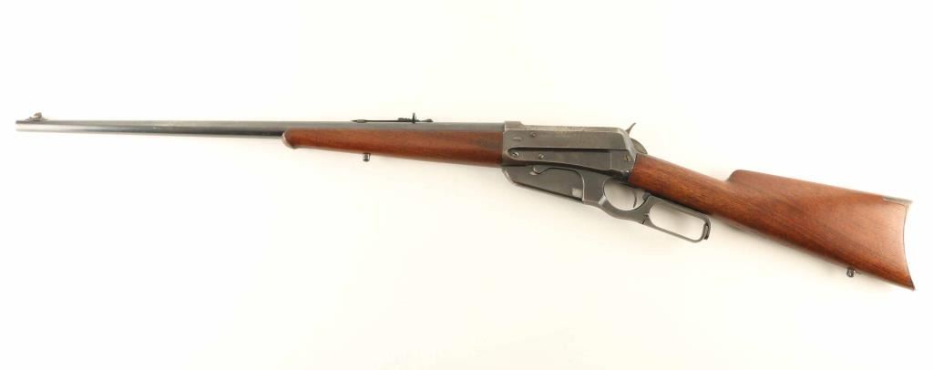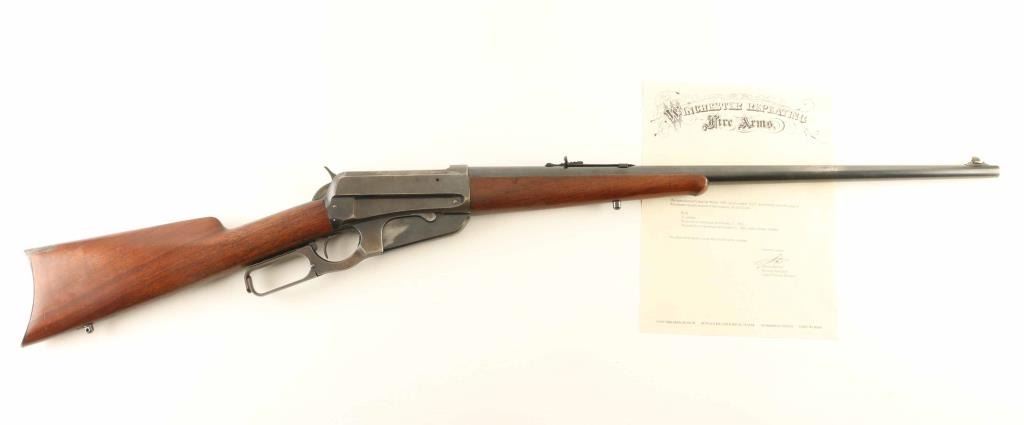 'Sporting Rifle' manufactured circa 1902. Features 24" barrel, buckhorn sights, vertical box magazine, straight grip, steel crescent buttplate, sling studs, schnabel tip forend with fancy ebony colored insert, cross hatched anti-glare panel on receiver ring. Bore is good condition, lightly frosted with strong rifling. Retains 65% blued finish, some patina and pitting on top of action, thinning to gray or bare metal on high spots & sharp edges, bare metal where action parts rub, scratches and areas of bare metal on barrel. Receiver has several dents and deep scratches. Screw heads show some marring of slots. Buttplate is good condition, patina brown over bare metal. Forend is good condition, with small area of sharp dents to left side, shallow dents many places. Stock is very good condition with small dents and scratches. Wood to metal fit is good overall. Two line address on receiver is sharp, with some light pitting over letters. Caliber marking is crisp, "Nickel Steel / Smokeless Powder" marking on barrel shows some thinning across top. No proofs observed on receiver ring or breech. Action operates smoothly. Includes letter from Cody Firearms Museum / Buffalo Bill Historical Center listing manufacturer's data for this rifle as shipped from the factory. Condition is NRA Good+ *** C&R Firearm ***