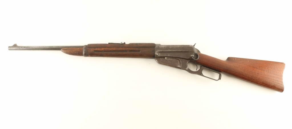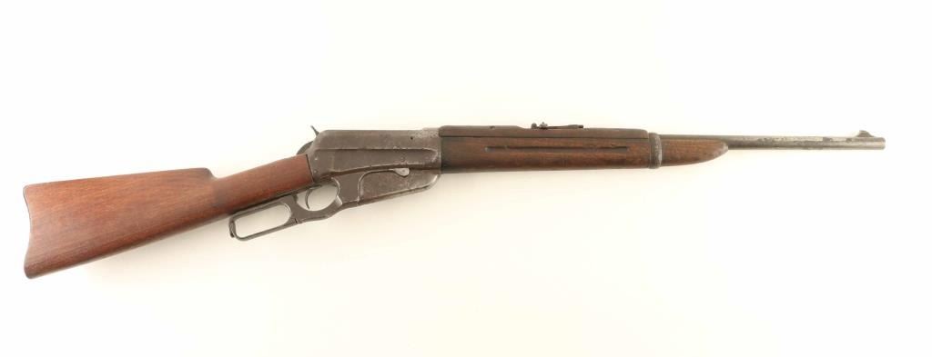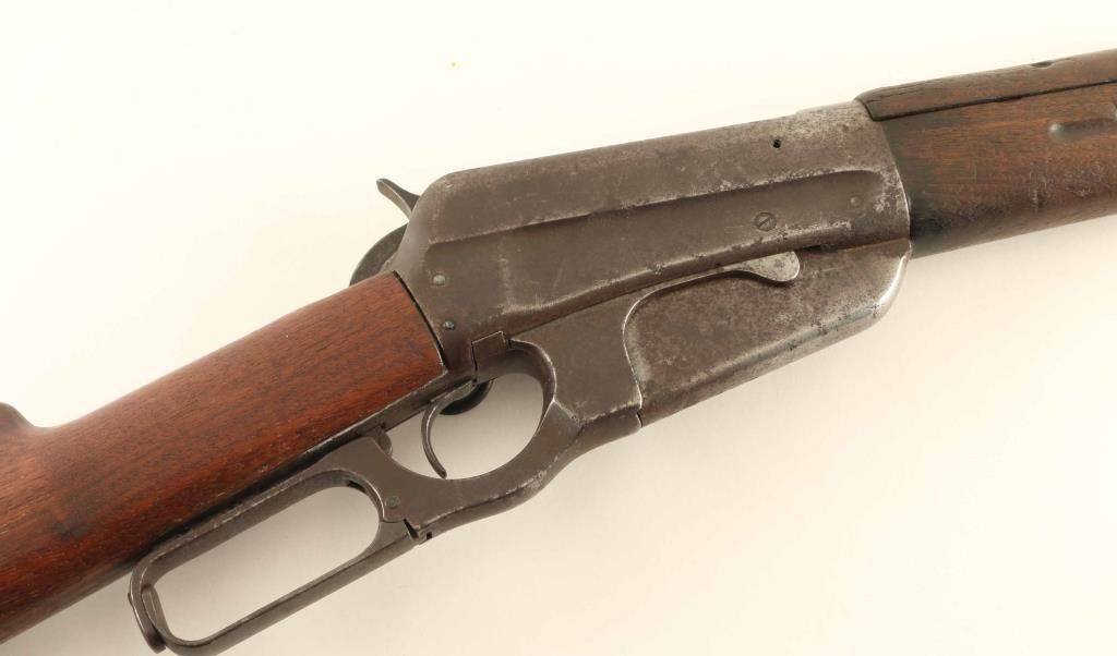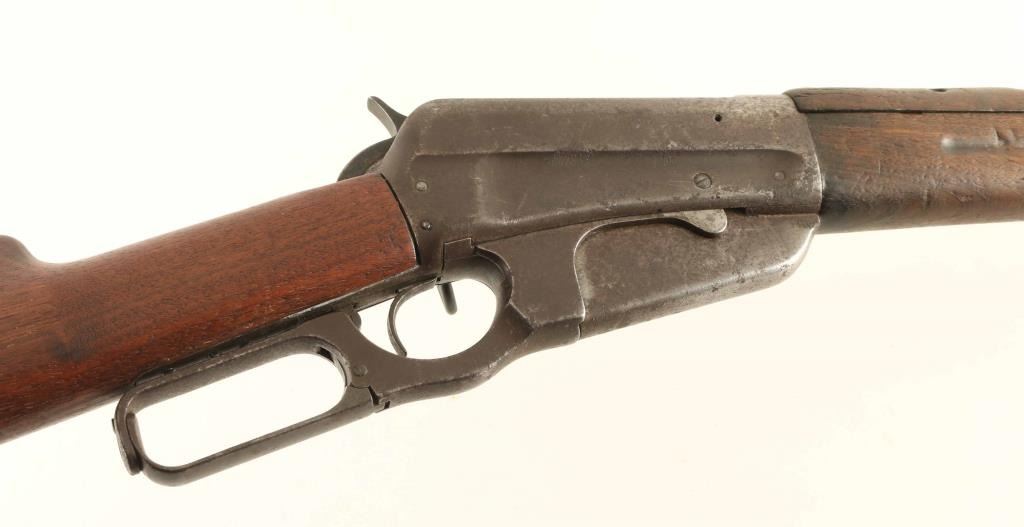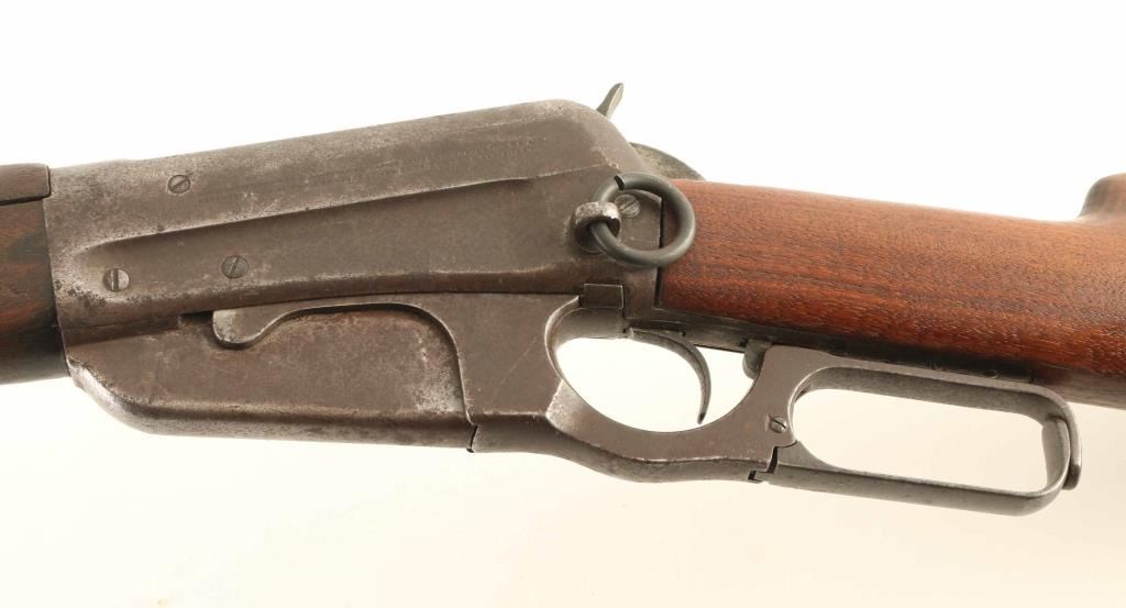 Lever action rifle manufactured circa 1915. Features blued finish, wood forend with finger groove, wood handguard, straight gripped stock, curved steel butt plate with sliding trap door, 22" barrel, fixed box magazine, flip up rear ladder type sight, blade front sight, saddle ring on left side of receiver. Bore is frosted with drk grooves, strong rifling. Metal surfaces are mostly brown patina color, pitted in many places, with brighter color under patina at barrel, bare metal on sharp edges. Forend & handguard are fair serviceable condition, with smooth shallow depressions and dents throughout. Stock is good to very good condition with good fit to metal at butt, fair fit at tang. Condition is NRA Good *** C&R Firearm ***