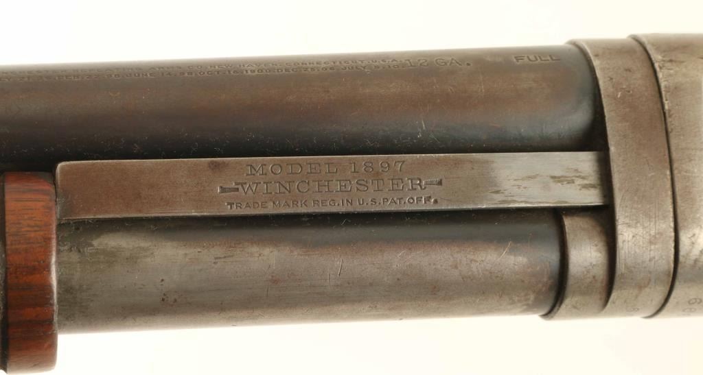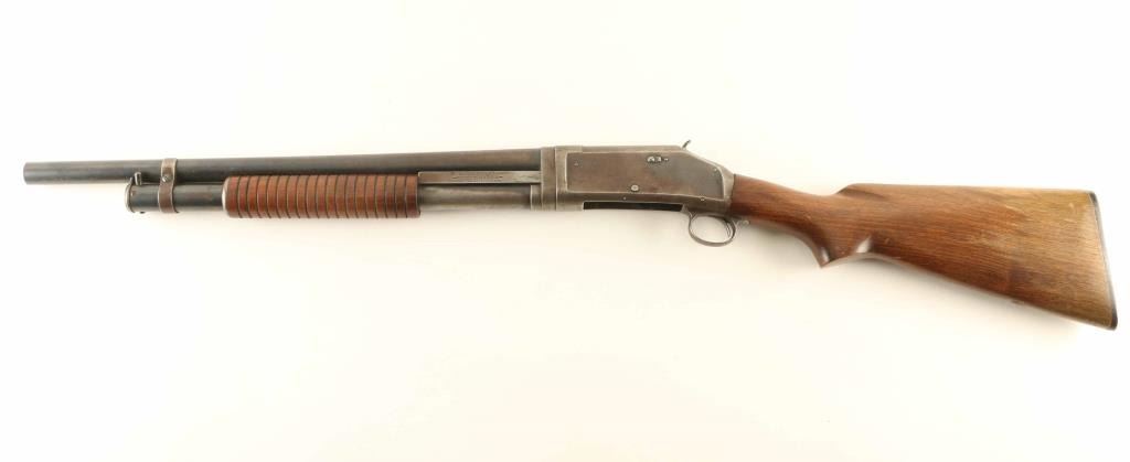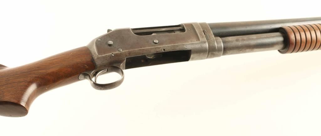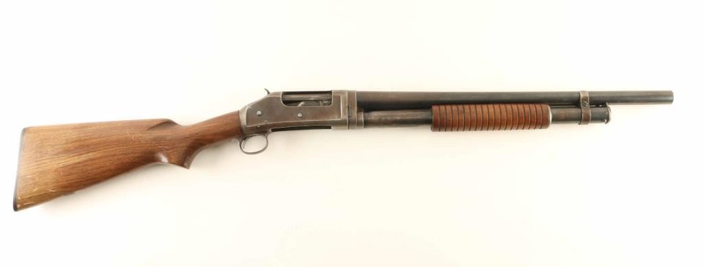 Shotgun. Pump-Action. 20" round barrel. Fed from a 5-rd tube magazine. Produced 18978-1957. Walnut stock, and grooved forearm. Exposed hammer. Winchester markings are crisp/clear on barrel, and slide. Wood stock, and forearm are very good, with minor scratches/dings. Bore appears good/bright, but dirty. Blued metal finish is about 40%, mostly on the barrel/tube. Receiver has turned a plum/gray color, with traces of blue. Action is a little stiff, needs oil. NRA Condition-Good. C&R Firearm.