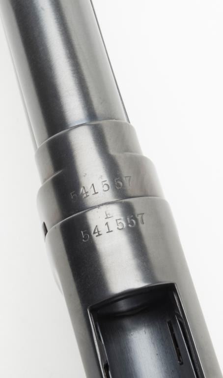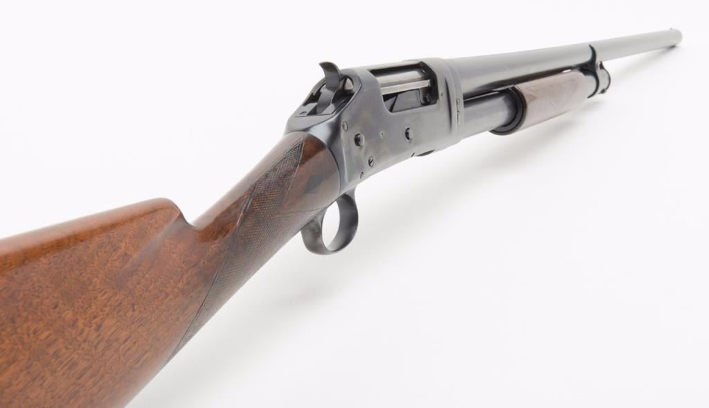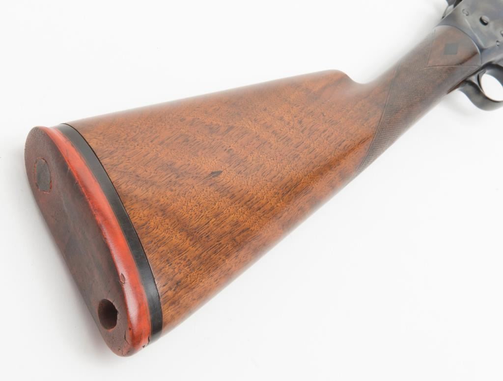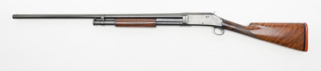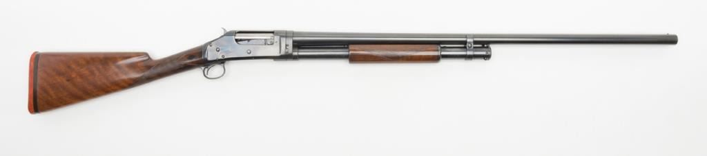 Winchester Model 1897 Black Diamond Grade pump action takedown shotgun, 12 gauge, full choke, 30” barrel, old re-blue finish, deluxe checkered wood stocks, added hard rubber butt pad, #E 541557 in overall very goodcondition as re-finished, fine bore, crisp action, beautifully grained wood stocks, matted top of barrel. (C&R/PPT). Est.: $500-$1,000.