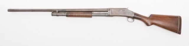 Winchester Model 1897 takedown shotgun, 16 gauge, full choke, 28” barrel, wood stocks, added hard rubber butt pad, #E 458081 in overall good condition with a grey patina, good bore, action and fair to good wood withshortened butt stock, repaired crack at wrist of butt stock. (C&R/PPT). Est.: $300-$500.