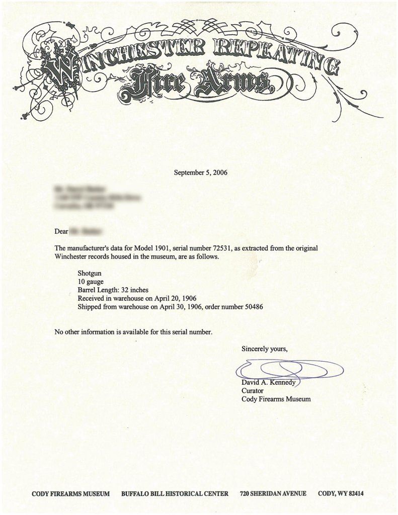 Factory letter confirms 10 gauge, barrel length, and shipped on April 30, 1906. LOP 13".