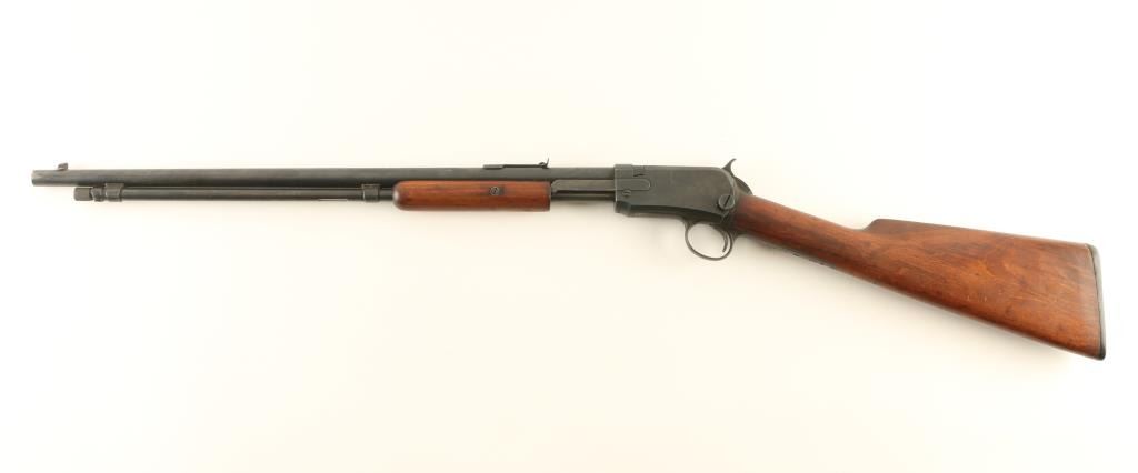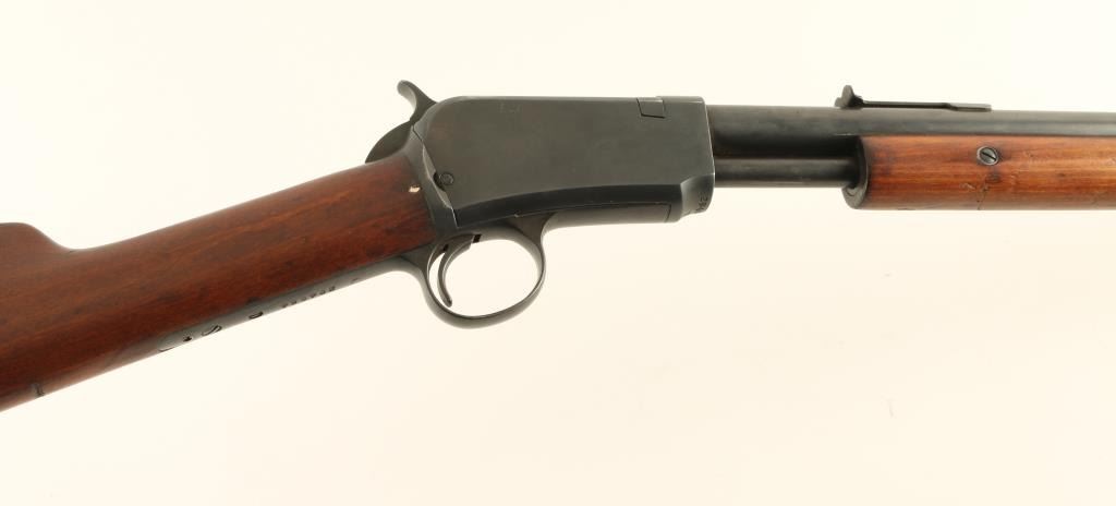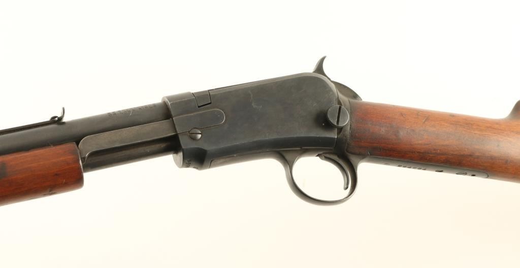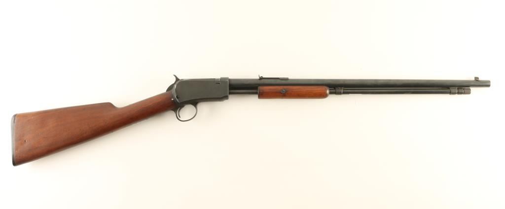 Rifle, Pump-Action. 20" round barrel, with open iron sights. Tube magazine, Take-down bolt on the left receiver. Action is crisp/tight. Bore appears ok, with some minor pitting. Metal, and wood are excellent as the rifle has been restored. Manufactured in 1912. NRA Condition-Very Good. (Restored) C&R Firearm.