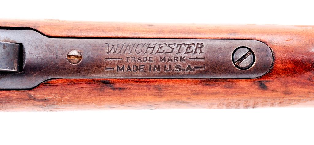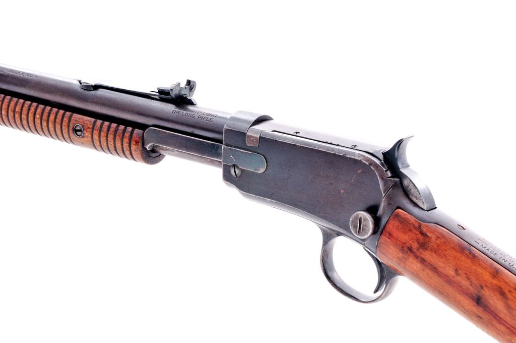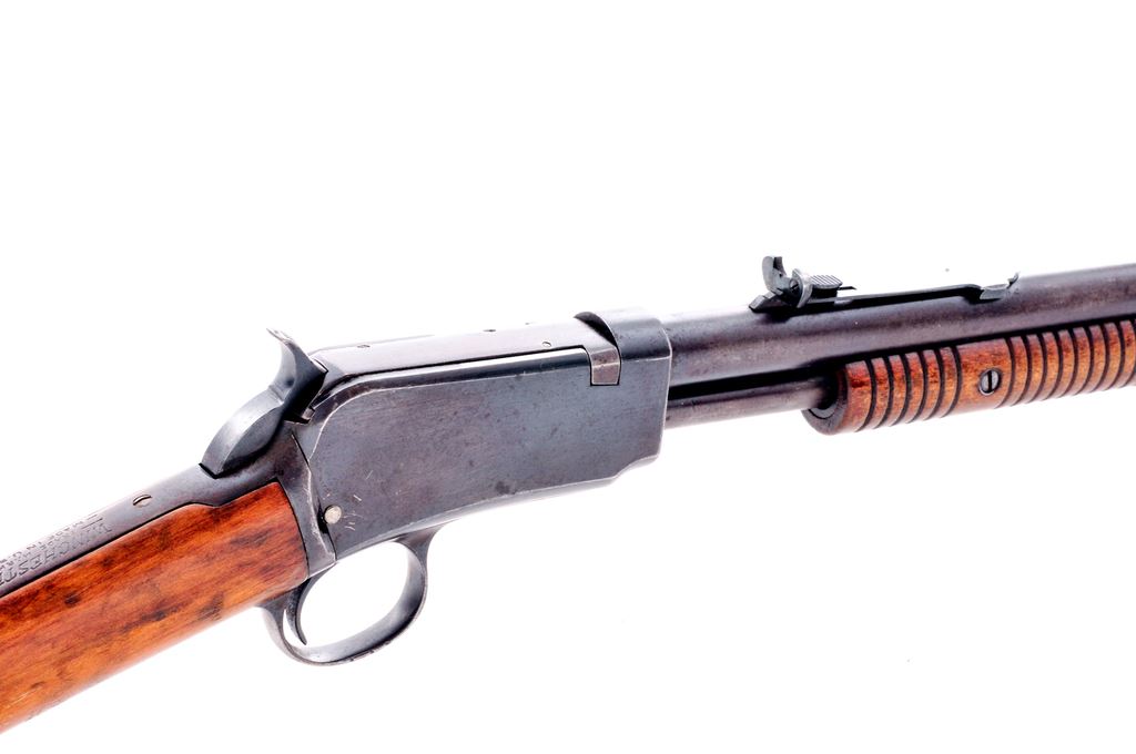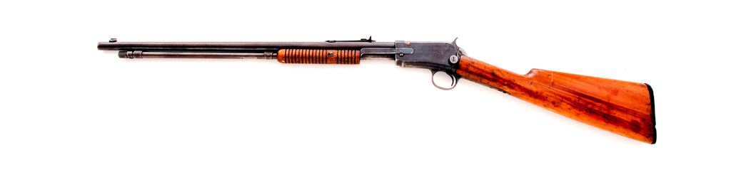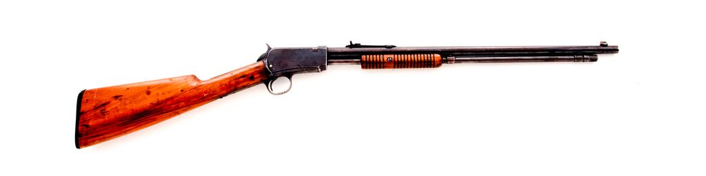 Winchester Model 1906 Pump Action Rifle, #813581, .22-S-L-LR cal., 20'' round barrel, straight grip gumwood stock, black composition Winchester buttplate and 19-groove forend, dovetailed Marble's front sight, and sporting elevator rear sight. Top of barrel and receiver are Winchester proofed. Condition is good. Metal with a mostly brown patina; receiver and protected areas between the barrel and magazine tube with a small amount of toning blue finish. Stock shows age and wear consistent with the metal surfaces and has been sanded leaving the buttplate with a small reveal; an older coat of varnish has been added; varnish has flaked in some spots. Barrel address is clear; Winchester proofs are a little worn. Good action, bright bore that shows moderate wear to the rifling. Est.: $150-$250. (C&R)