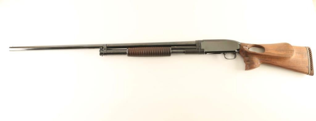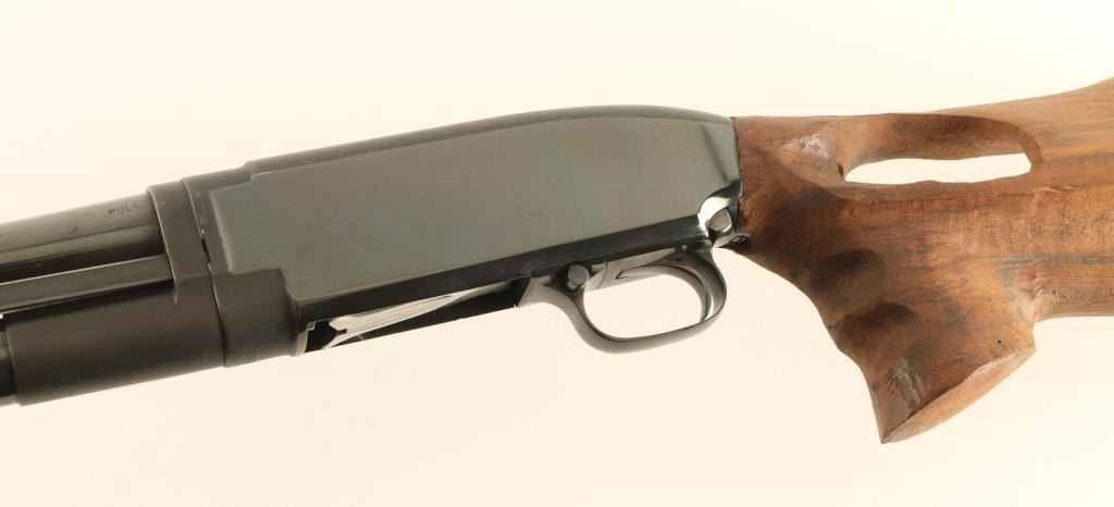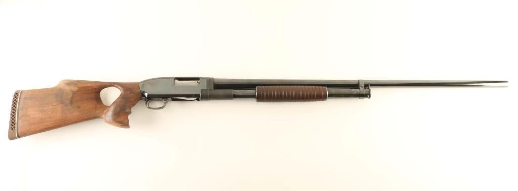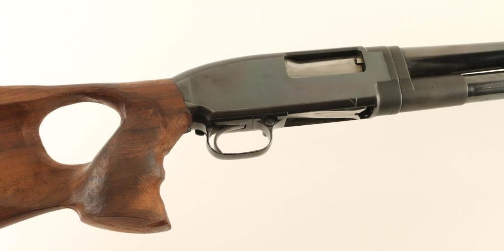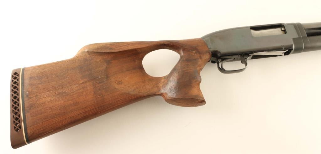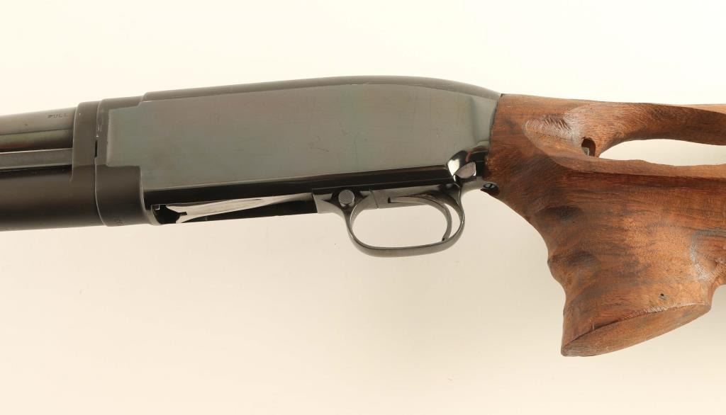 Vintage slide action repeating shotgun chambered for 2 3/4" 12 Gauge shells, manufactured in New Haven, CT circa 1918. Features a blued refinish, full choke 32" take-down barrel, brass bead front sight, 6 round tube magazine, smooth trigger, cross-bolt safety, milled steel receiver, grooved walnut slide handle, and custom thumb hole pistol grip shoulder stock with right handed roll-over cheek piece, Pachmayr recoil pad marked “Ralph Voss” & 14” LOP. Serial numbers match on the receiver and receiver extension. Shotgun retains approximately 90% of its blued refinish showing scattered scratches, some thinning and slide wear on the magazine tube & action bar. The magazine tube does not lock up tight. Action is sound, the bore is bright showing some dings & light corrosion or debris, and the wood stocks are good with small losses. Condition in NRA Good as refinished. ***C&R Firearm***