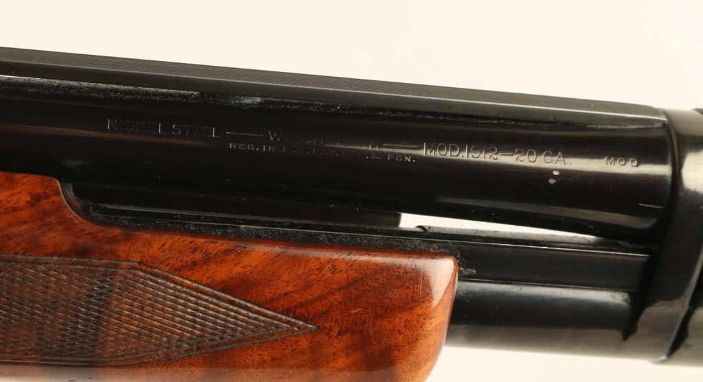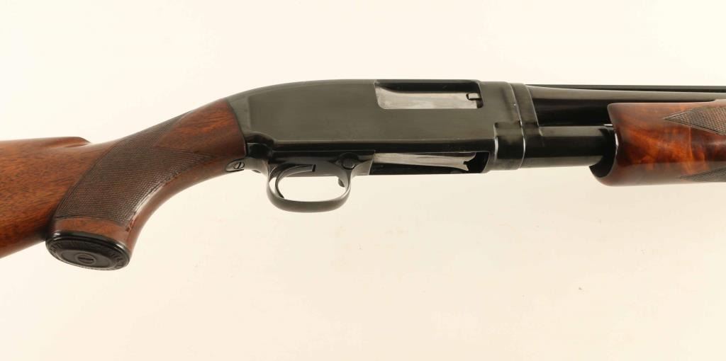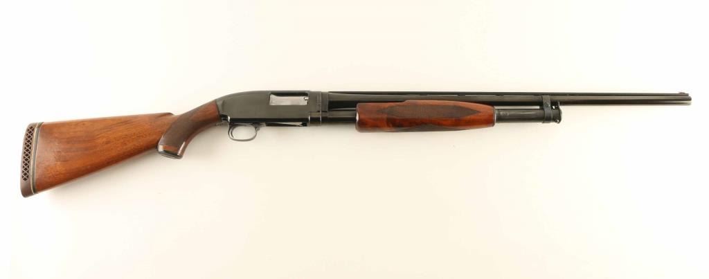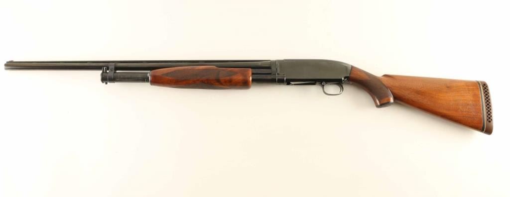Pump action shotgun features 25" vent rib barrel, barrel labeled "MOD" but choke measures "IC", accepts 2-3/4" shells, Bradley front bead with red plastic insert, white polymer mid bead, blued finish, wood stock & pump handle, ventilated rubber recoil pad, manual safety. Bore is very good condition. Retains 85% blue, appears re-blued with some markings dished out slightly, bare metal on sharp edges, where action rubs, scratches to metal. Wood is very good condition with scratches, scrapes. Recoil pad is fair condition, loose on stock. Condition is NRA Very Good as reblued *** C&R Firearm ***