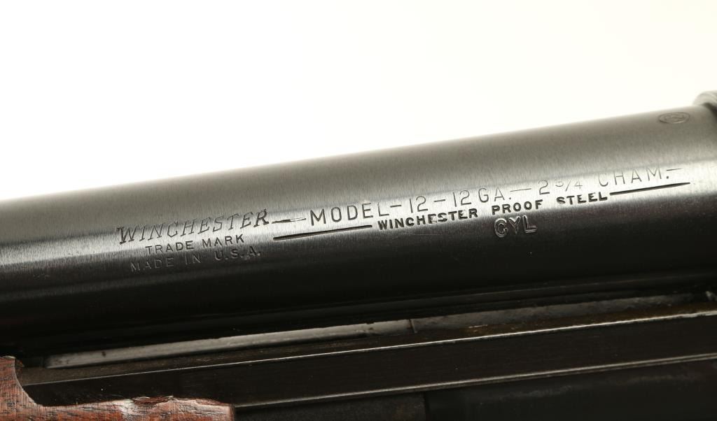 Winchester Model 1912 pump action take down shotgun, 12 gauge, 21” barrel, S/N 1737655, blued finish, wood stocks with butt stock stamped “PROPERTY OF RY EX AGY”. This shotgun is in overall very good to fine condition displaying the majority of its original blue finish, fine bore, crisp action, sharp markings and very good wood with the butt stock displaying scattered nicks and scratches from storage; leather sling is also present. (PPT). Est.: $800-$1,600.