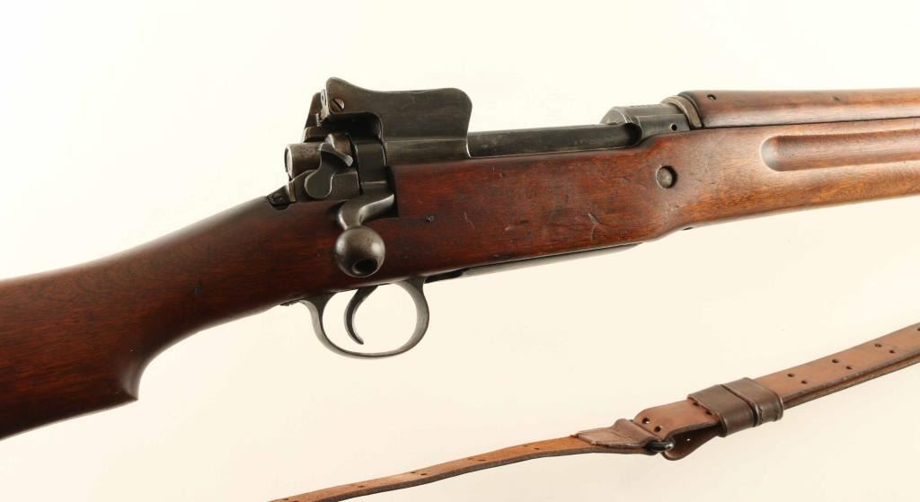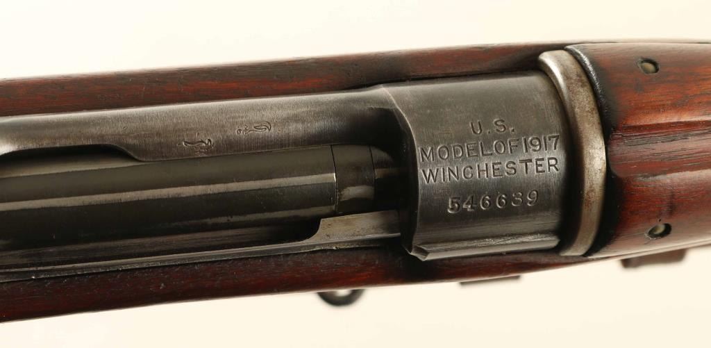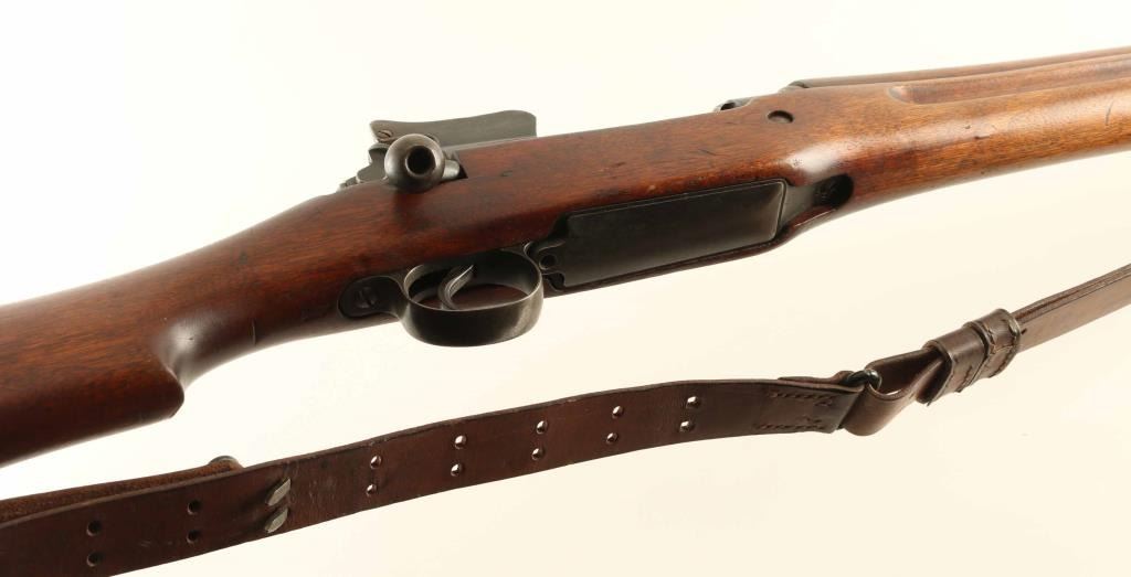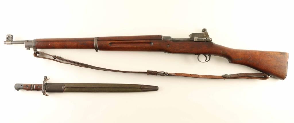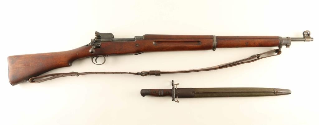 American military rifle use in both World Wars. Features dog-leg bolt handle, peep style sights, approx 26 inch barrel. Bore is in very good or better condition, shiny with crisp rifling, some frosting in grooves. Retains 70% coverage of a now mostly brown colored finish, thinning to bare metal on bands and raised edges. Stock is in good to very good condition, with gouges or scrapes in many areas. Barrel is marked "W" over flaming bomb, over "2-19". Flaming bomb stamp on left side of receiver, and on bolt handle next to a partial "W". Left side of stock stamped "ID" (or "1D") under bolt release. Includes fair condition leather US type sling, very good condition bayonet & scabbard. Bayonet is marked "1917" over circled "W", "US", and flaming bomb marked. Condition is NRA Good ***C&R Firearm***
