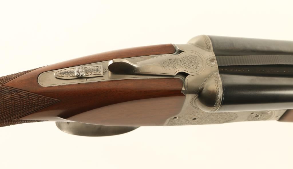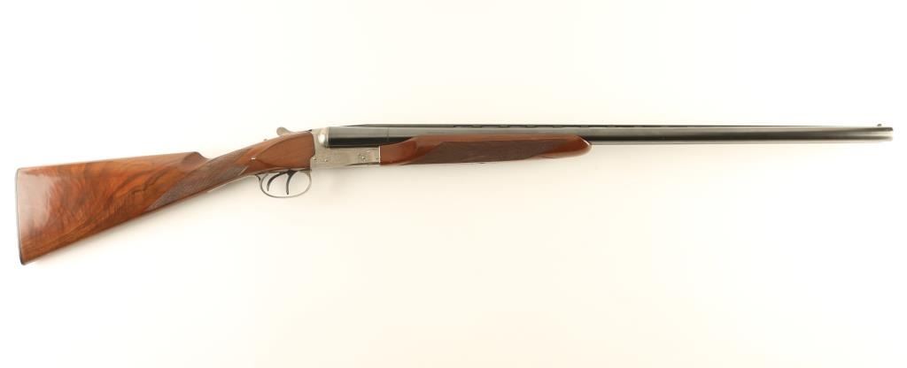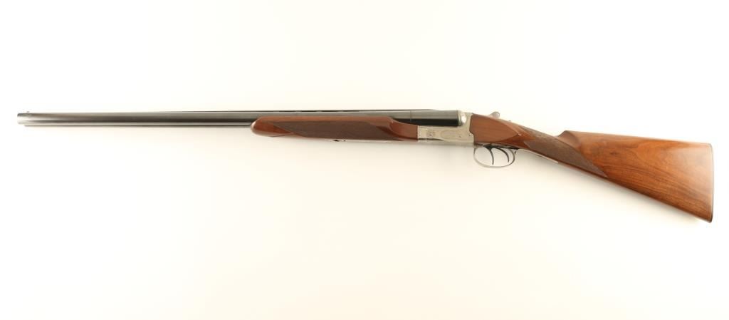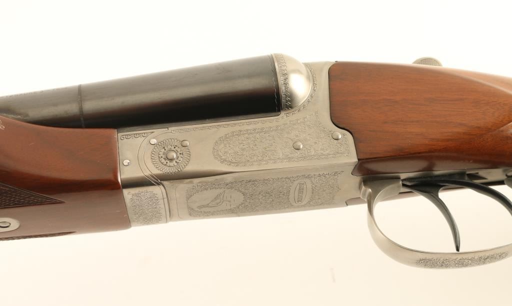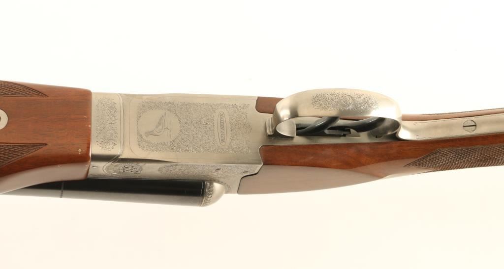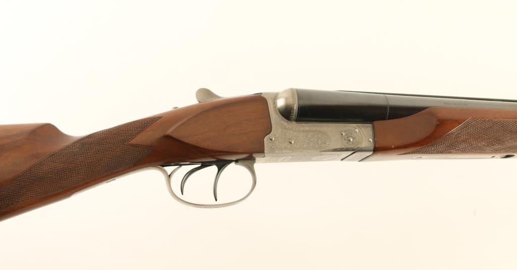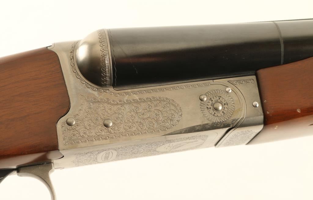 'Pigeon Grade' Japanese Side by Side shotgun imported by Winchester, East Alton IL. Accepts up to 3" shells. Features blued barrels & triggers, coin finished action, checkered beavertail wood forend, checkered straight wrist fancy walnut stock with flat plastic buttplate, 28" vent rib barrels, chokes measure IM left & IC right, large white polymer front bead, small white polymer mid bead, tang safety with side selection, double triggers, independent ejectors. Selector on safety does not affect use of dual triggers, and both ejectors trigger if either barrel is fired. Bores are very good, need cleaning. Barrels retain 95% blue with scrapes to rib & near muzzle. Other metal parts are excellent condition. Wood is very good to excellent with some scratches & dents, mostly at butt. Receiver features 75% or better coverage of fine featured floral scroll engraving. Condition is near NRA Excellent *** Modern Firearm ***