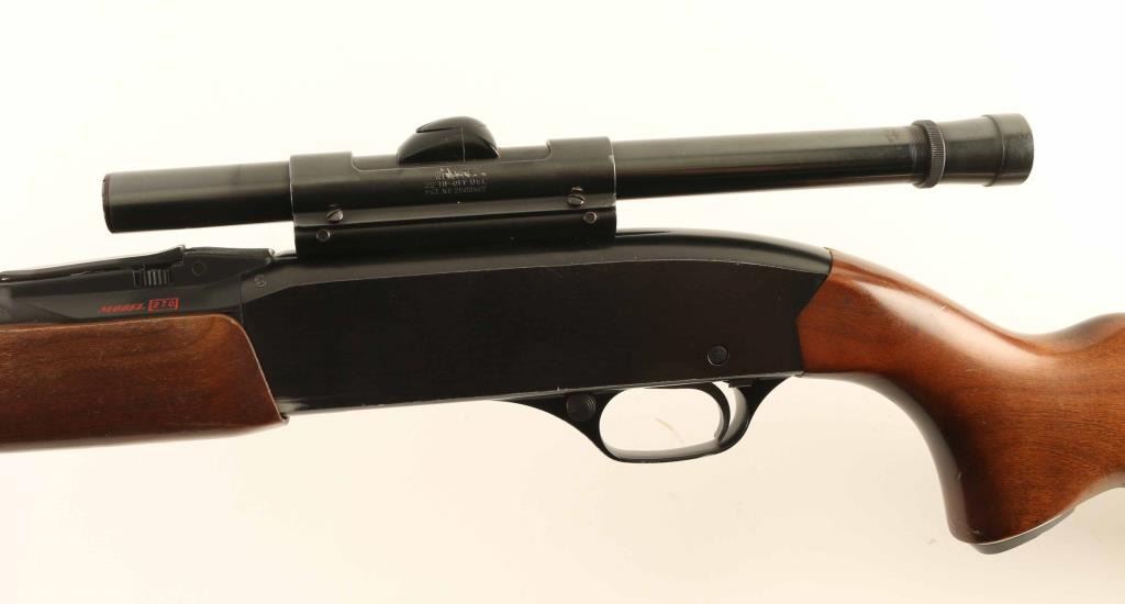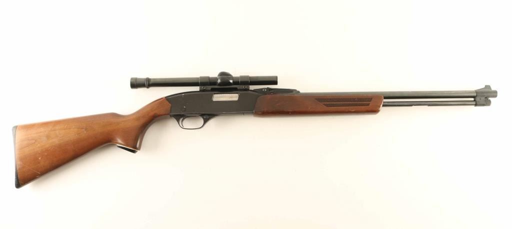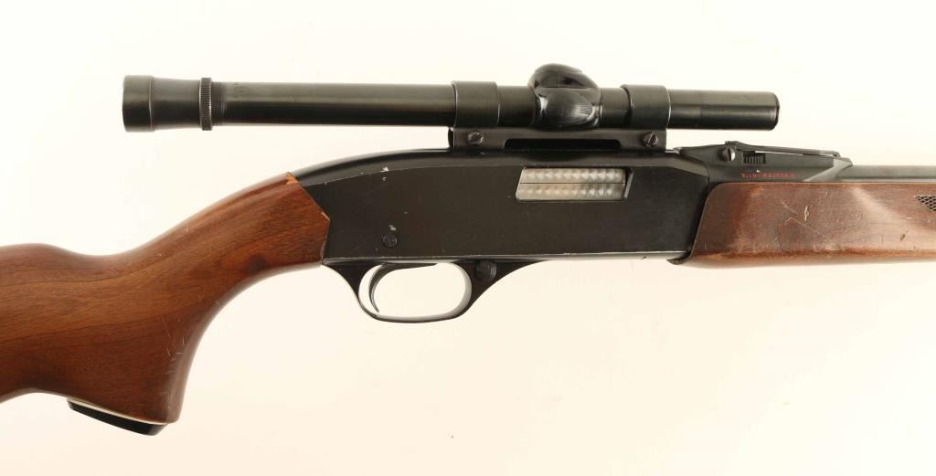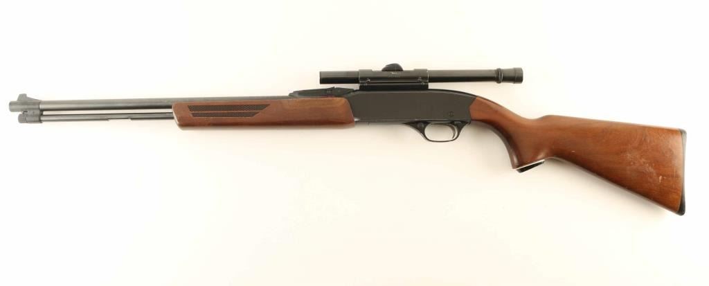Vintage slide action repeating rifle chambered for .22 Short, Long or Long Rifle, manufactured circa 1963-1969. Features a blued 20.5” Barrel, full-length tube magazine, blade front sight, fully adjustable rear sporting sight, Weaver B4 4x fixed power scope installed with a Weaver .22 Tip-Off mount, smooth trigger with beveled & serrated edges, push button safety, machine turned bolt, back finished alloy receiver, press checkered slide handle, and semi-pistol grip shoulder stock with black synthetic grip cap & buttplate. Rifle retains approximately 90% of its original finish showing scattered scratches/bright dings, slide wear on the front of the receiver from the slide handle and carry wear on the bottom of the receiver. Action is mechanically sound, the bore is excellent and the wood stocks are good with blemishes & small losses. Condition is NRA Good. ***C&R Firearm***