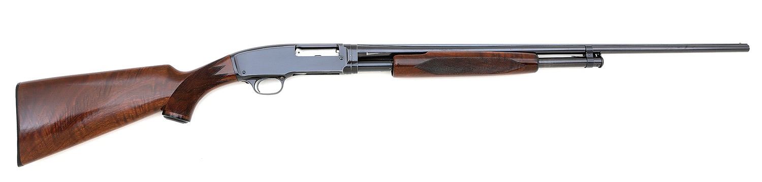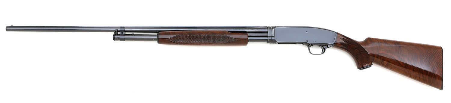serial #100570, 410 bore (2 1/2''), 28'' solid rib barrel choked skeet with a bright excellent bore showing some wad residue at the muzzle. The metal surfaces retain about 90% original blue, appearing stronger under ambient light, with light wear on high edges and contact points, some light handling marks, and scattered specks of old oxidation and pinprick pits. The bolt and carrier are bright, showing a few light pits. The checkered capped pistolgrip custom walnut stock is in excellent condition with a light ding and handling mark or two, it is nicely checkered and shows attractive grain figure; the checkered forend is in very good plus to near excellent condition with an easily missed repaired 1/4'' crack on the right rear, some light handling marks, and an older nice added finish. The Winchester markings are intact and largely clear, parts of the barrel address and the choke mark lightly softened, the barrel shows a properly offset ''WP'' proof with corresponding proof on the receiver, the barrel is ''49'' dated, and the receiver extension is numbered to the gun. The shotgun is sighted with a lone brass bead. An attractive early 1950's Model 42 for the smallbore Winchester enthusiast. (14B11523-11) {C&R} [Jim Thrash Collection] (2500/3500)