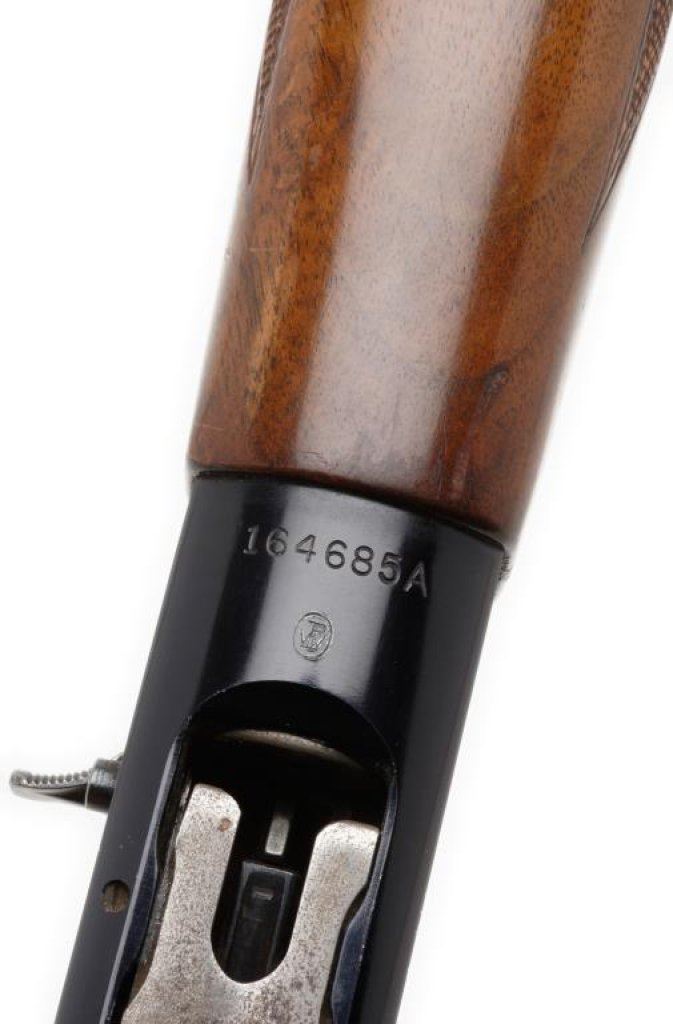 ++Winchester Model 50 semi-automatic shotgun, 12 gauge, 2.75” chamber, 28” barrel, S/N 164685A, blued finish, checkered wood stocks with red hard rubber butt pad in overall very good to near fine condition showing the majority of its original finish, crisp action, sharp markings and very good wood. Est.: $250-$500.