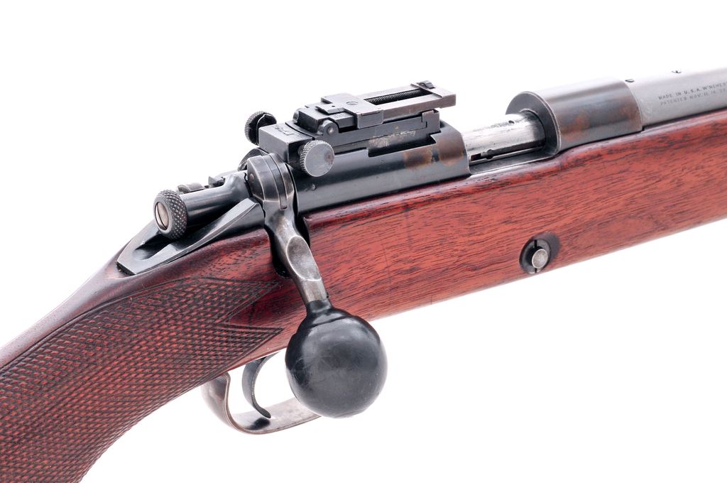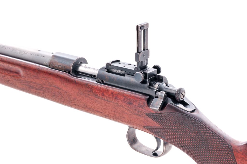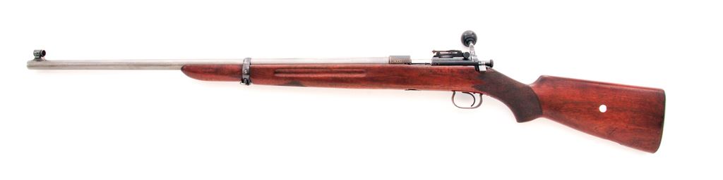 Winchester Model 52 Bolt Action Target Rifle, #14753, .22 LR cal., 28'' factory stainless steel barrel, blue frame and triggerguard, coarse checkered walnut stock, checkered steel buttplate, with standard rear and Winchester globe front sight. Mfg'd 1929. Condition is very good as modified. Frame with approx. 60% blue. Four additional holes threaded and tapped to left side of frame. Rubber ball added to bolt handle for ease of manipulation. Stock is fine with only light marks. Rear sling swivel slot has been filled with red leather, which can easily be removed. Smooth action, crisp trigger, mirror bright bore. Est.: $600-$800. (C&R)
