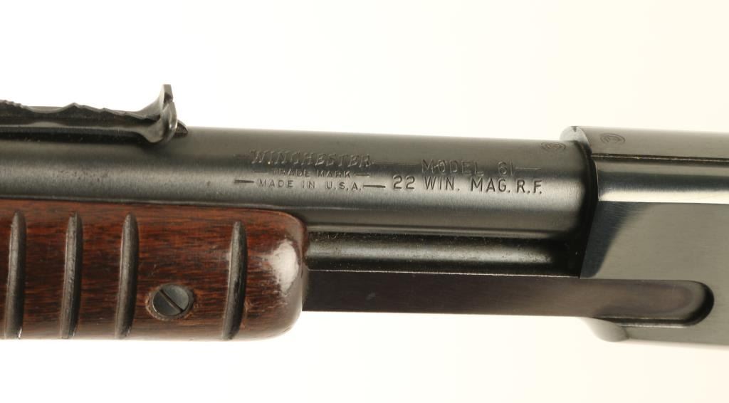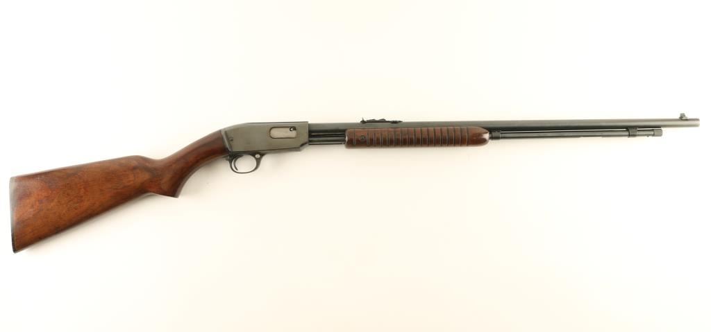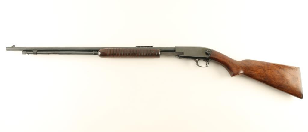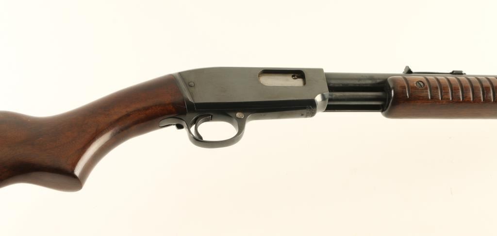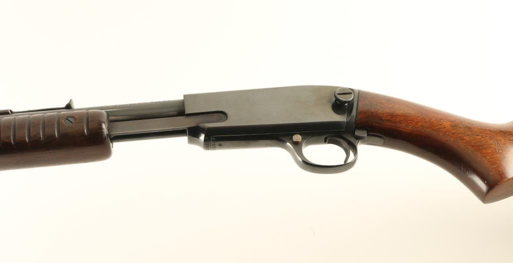 Pump action rimfire rifle manufactured circa 1961. Features blued finish, grooved wood pump handle, wood butt with curved grip area, flat plastic buttplate, 24" barrel, buckhorn sights, magazine tube under barrel, manual safety, take down screw in receiver. Bore is very good condition. Retains 95% high polish blue, dark colored, with bare metal on some sharp edges and where pump handle rubs on barrel. Receiver cover shows evidence of polish & reblue. Letters on barrel retain sharp edges from the stamping process. Wood is very good condition with small dents around butt, small scratches and scuffs in many places. Numbers match on receiver and cover. Condition is NRA Excellent - reblue *** C&R Firearm ***