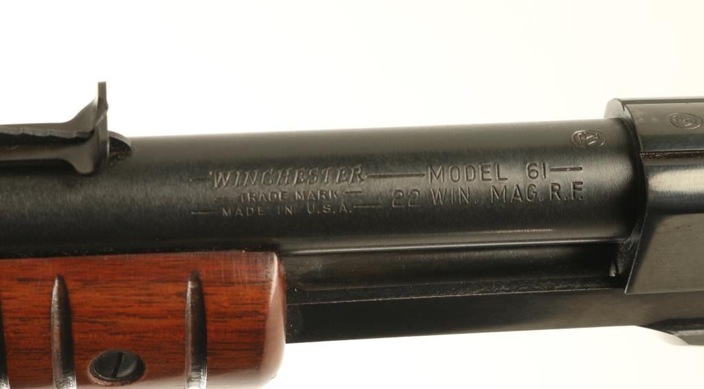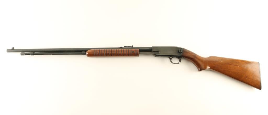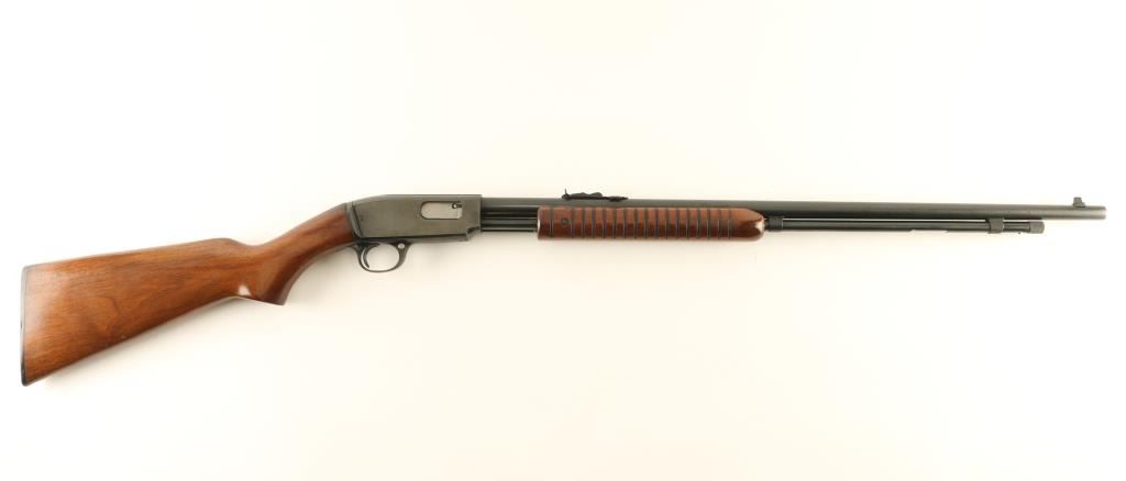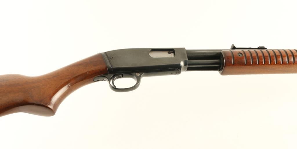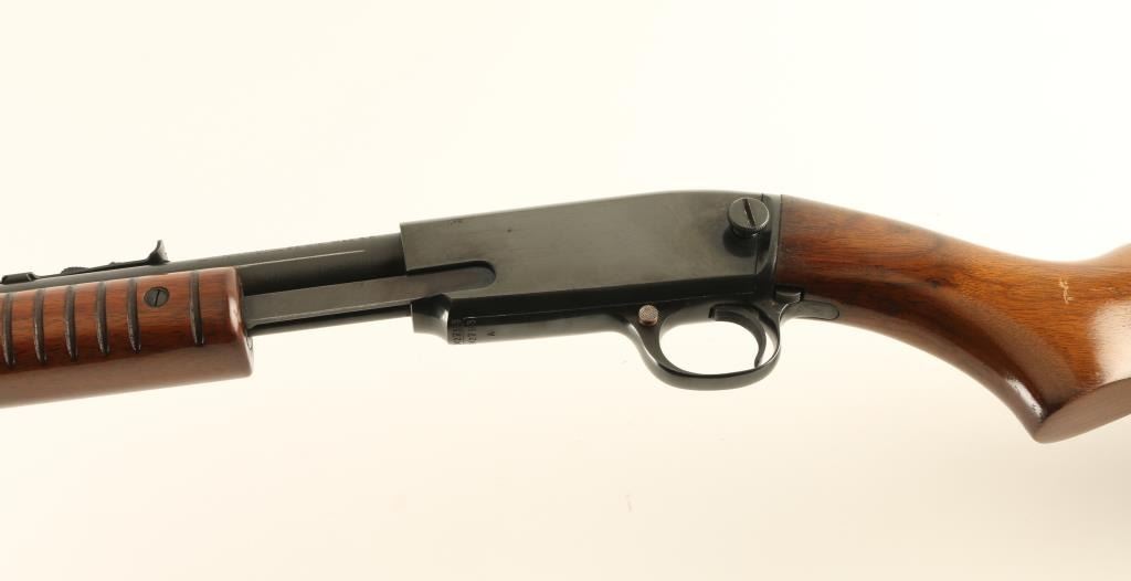 Pump action rimfire rifle manufactured circa 1962. Features blued finish, grooved wood pump handle, wood butt with curved grip area, flat plastic buttplate, 24" barrel, buckhorn sights, magazine tube under barrel, manual safety, take down screw in receiver. Bore is very good to excellent condition. Retains 95% high polish blue, dark colored, with bare metal on some sharp edges and where pump handle rubs on barrel. Letters on barrel retain sharp edges from the stamping process. Wood is very good condition with small scratches and scuffs in many places. Numbers match on receiver and cover. Condition is NRA Excellent *** C&R Firearm ***