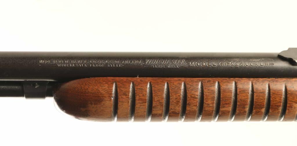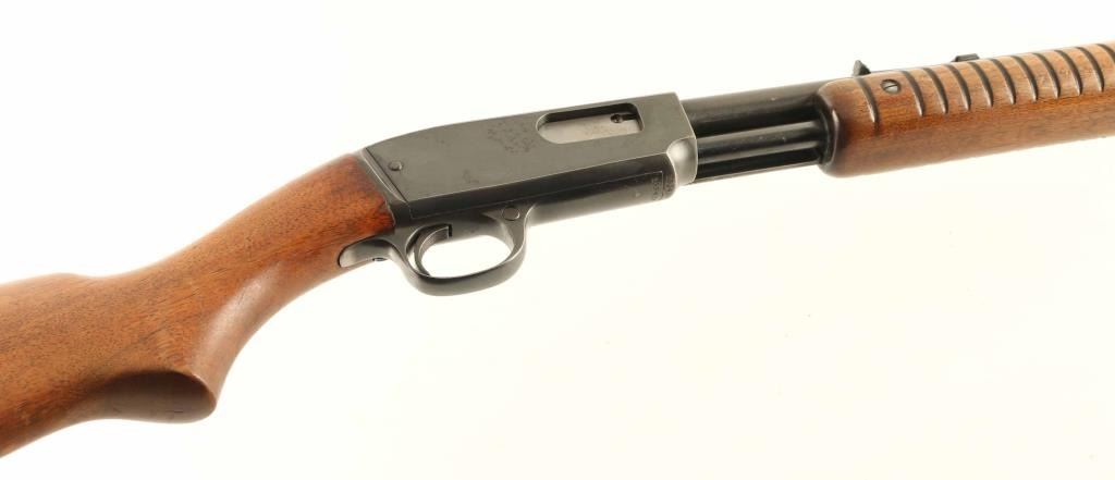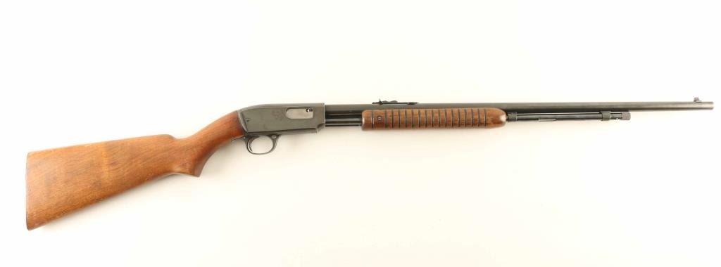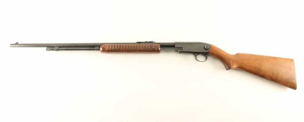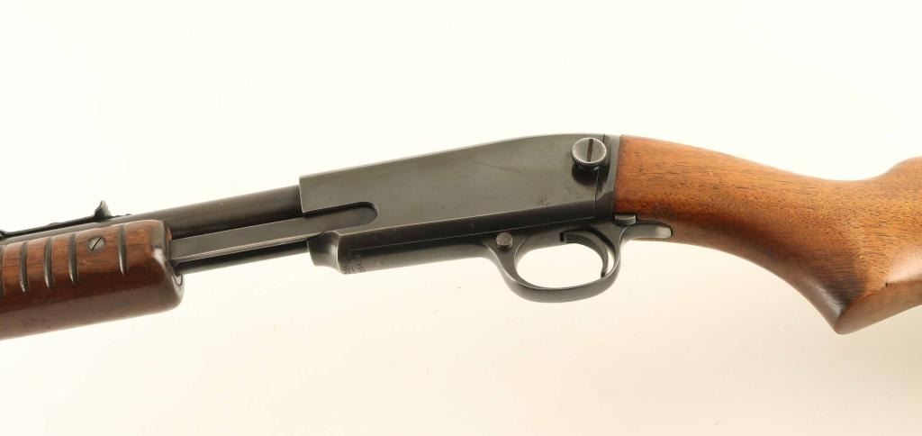 Rifle. Semi-automatic. Manufactured 1950. 24" round barrel, with front blade, and elev. adjustable notch rear. Fed from tube magazine. Walnut stock, steel buttplate, and ribbed foregrip. Bore appears excellent bright/bright. Action is crisp/tight. Wood is very good, with some minor scratches/dings. Blued metal finish about 90%, with edge wear, scratches. There is some pin-prick surface rust on the right receiver. NRA Condition-Very Good. C&R Gun