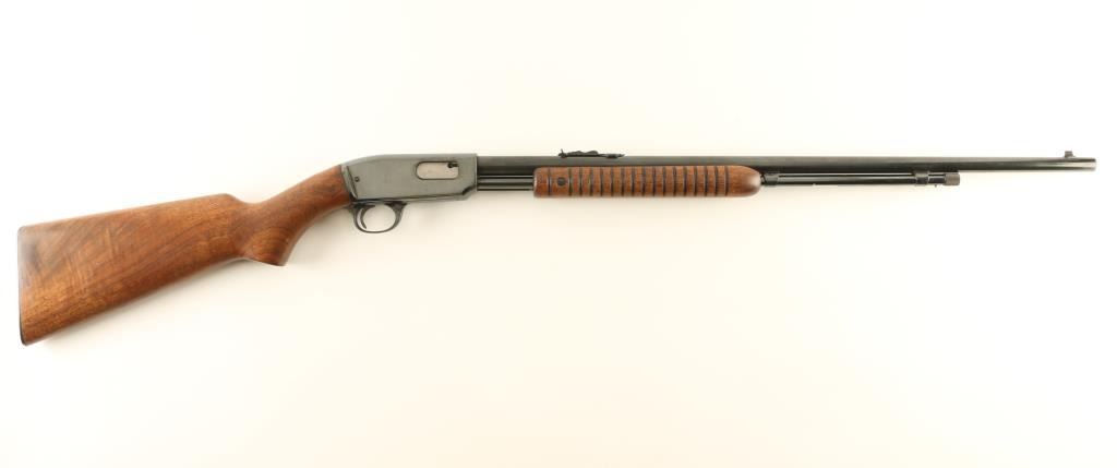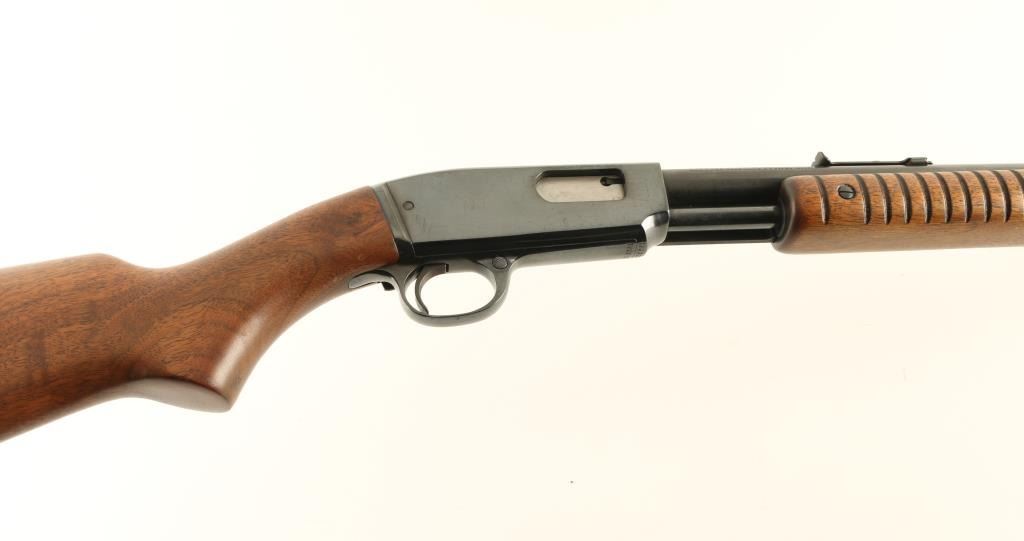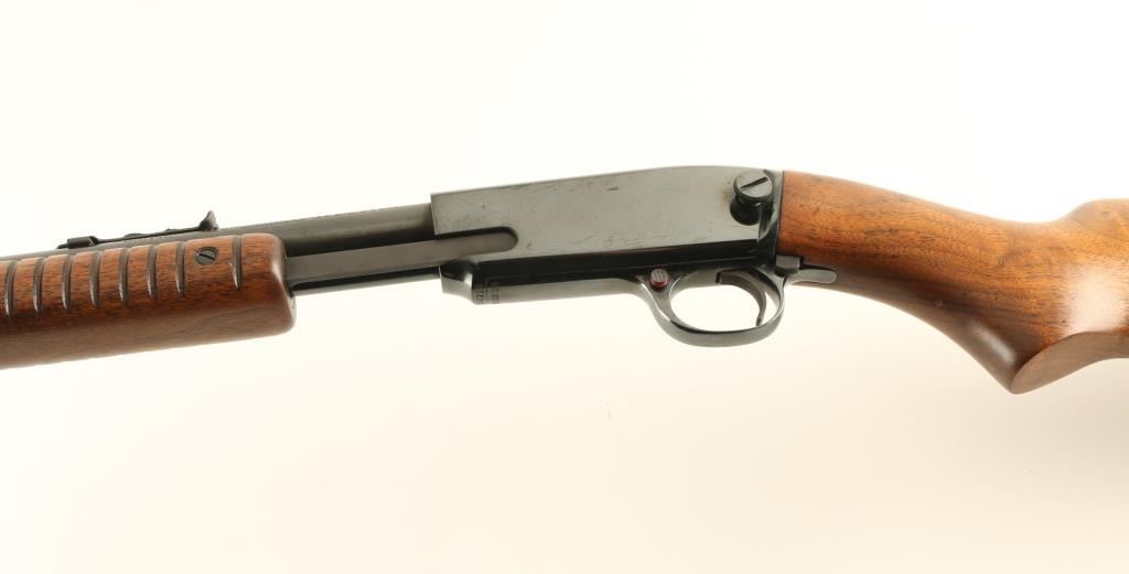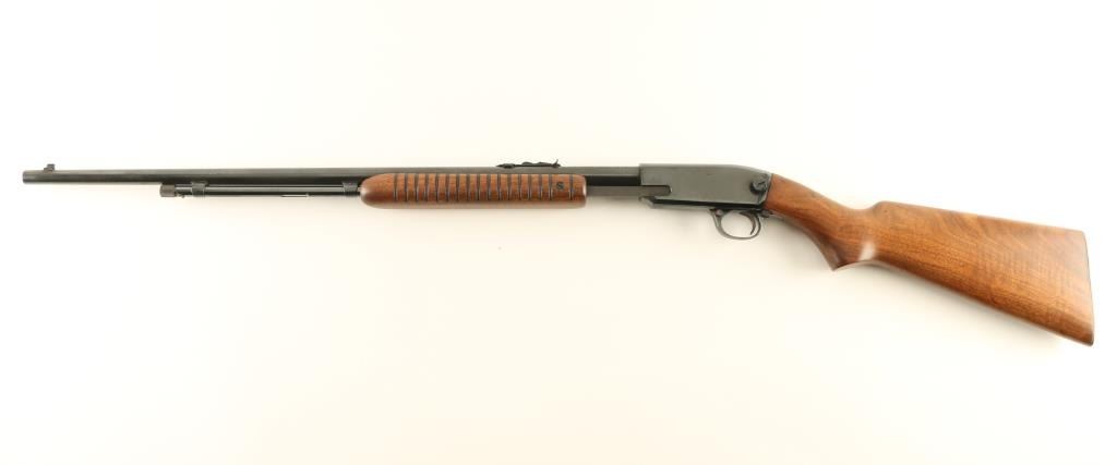 Pump action rimfire rifle manufactured circa 1953. Features blued finish, grooved wood pump handle, fancy figured wood butt with curved grip area, flat steel buttplate, 24" barrel, buckhorn sights, magazine tube under barrel, manual safety, takedown screw on receiver left. Bore is excellent, could be relined but no clear evidence of this. Retains 95% high polish blue, dark colored, with evidence of re-blued after careful polishing, some small areas of pitting visible under reblue at barrel. Wood is very good condition. Numbers match on receiver & cover. Condition is NRA Excellent - as refinished *** C&R Firearm ***