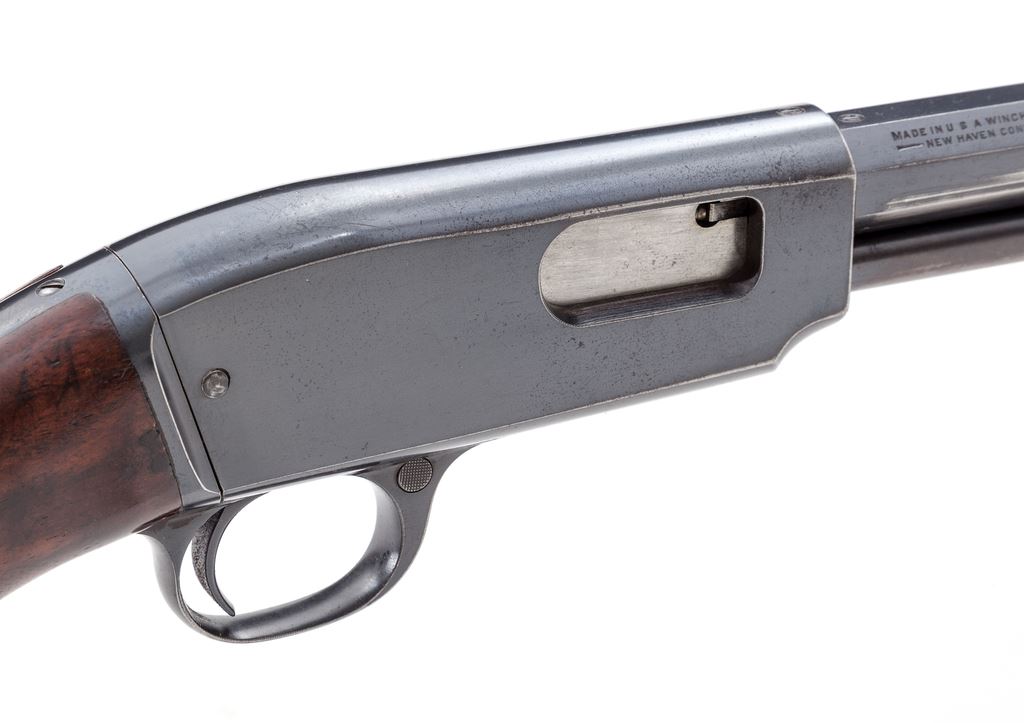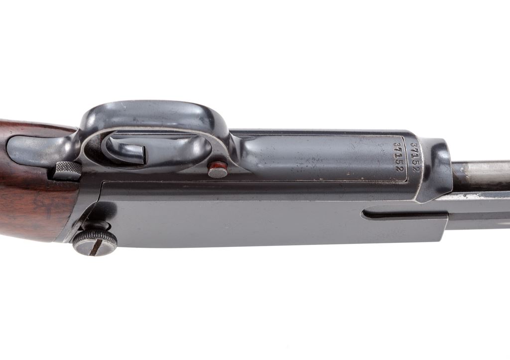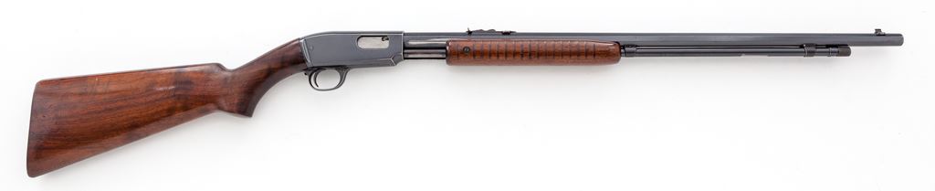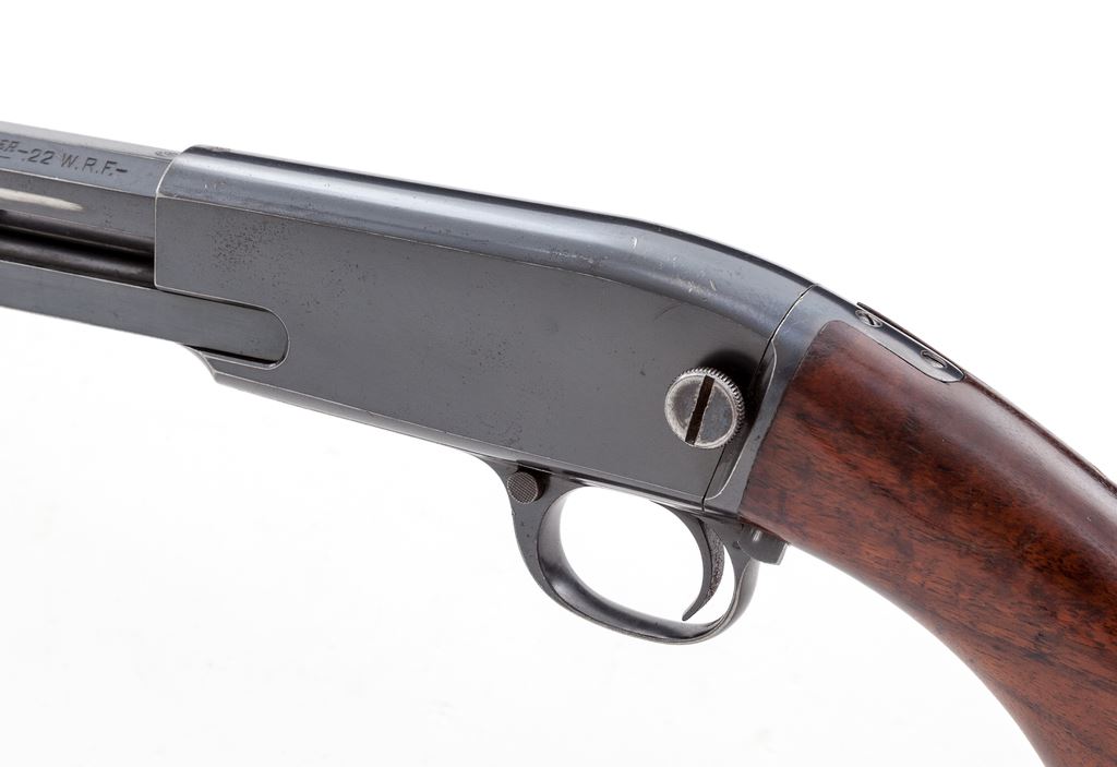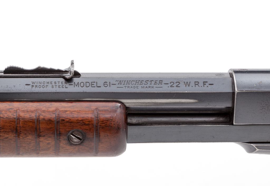 Winchester Model 61 Pump Action Rifle, #37152, .22 WRF cal., 24'' octagonal barrel, blue finish, walnut stock, 17-groove forend, checkered steel buttplate, with standard sights. Mfg'd 1939. Condition is fine to near excellent retaining approx. 95% lightly thinning factory blue, with small scuffs to top of receiver and in pump actioning areas of barrel side flats. Takedown screw retains approx. 70% blue. Stocks are excellent with small impressions and oil darkening near metal surfaces. Good action, bright bore. Est.: $1,200-$1,800. (C&R)