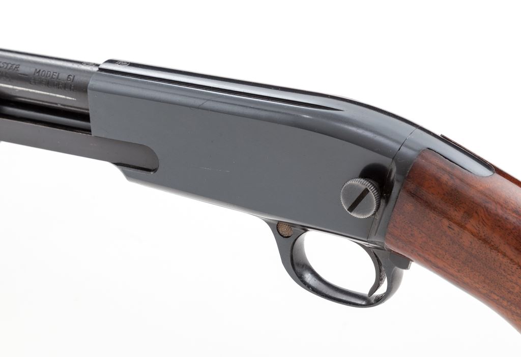 Winchester Model 61 Pump Action Rifle, with factory grooved receiver, #267104, .22 S-L-LR cal., 24'' round barrel, pistol-grip walnut stock with 17-groove forend, checkered black composition Winchester buttplate, dovetailed front sight with silver bead, and standard ''V''-notched elevator rear sight. Top of barrel and receiver are both Winchester proofed. Barrel is marked on the right side near the receiver ''WINCHESTER / TRADE MARK / MADE IN U.S.A.'' - ''MODEL 61 / .22 S.L. OR L.R.'' Mfg'd 1957. Rifle rates as excellent overall with approx. 98% original blue. Receiver with a nice polished blue finish and a small amount of scattered light scratching. Factory lettering is clear and well defined; barrel address and Winchester proofs with crisp edges. Wood shows intermittent shallow handling marks and impressions and retains nearly all of the finish. Action is smooth and crisp with an excellent bright bore. Est.: $700-$1,000. (C&R)
