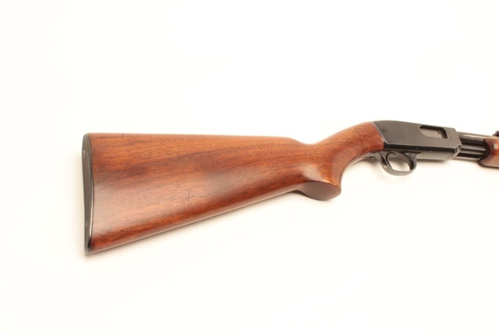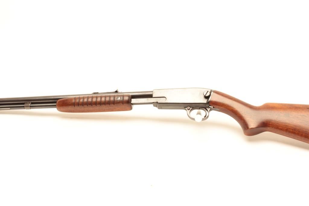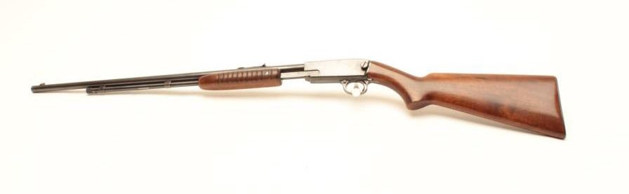Winchester Model 61 pump action rifle, .22 short, long or LR caliber, 24” barrel, blued finish, wood stocks, S/N 33845, in overall very good to fine condition showing the majority of its original finish, fine bore,crisp action and markings, very good to fine wood. (Modern/No PPT). Est.: $500-$1,000.