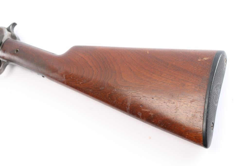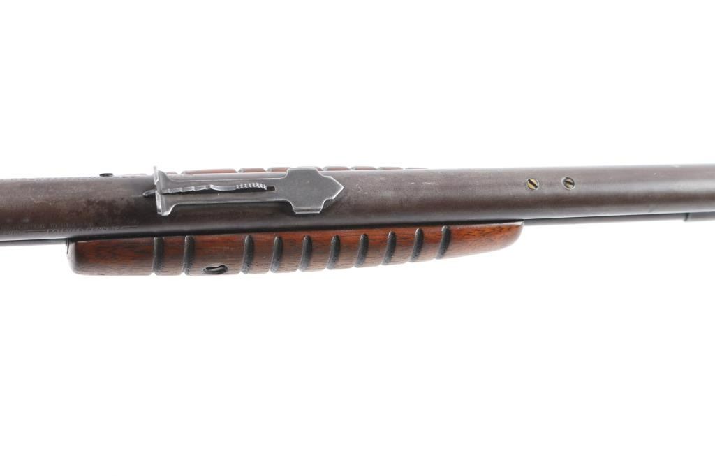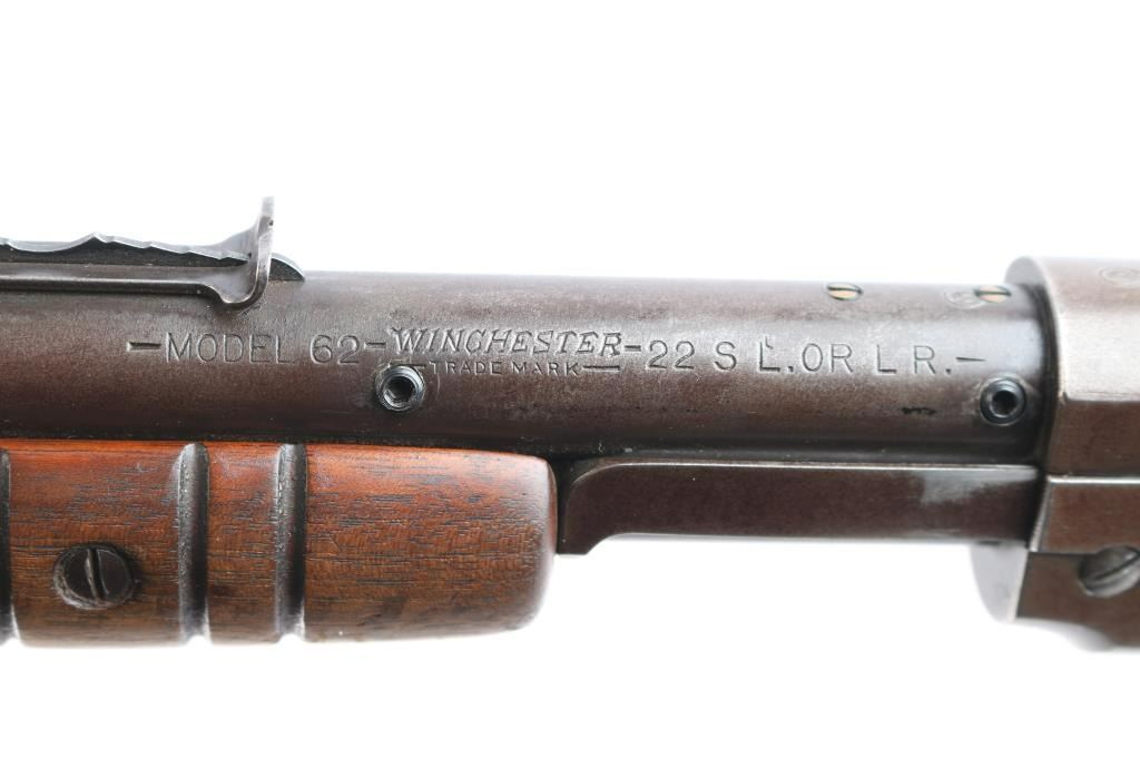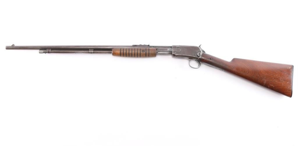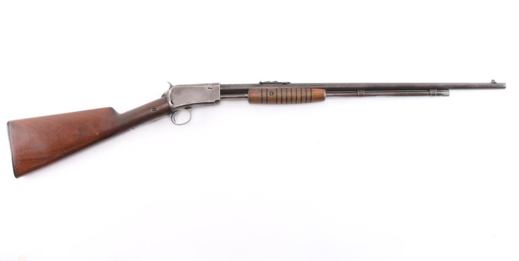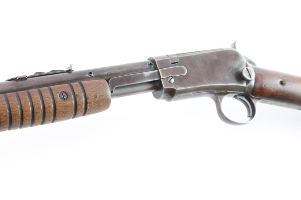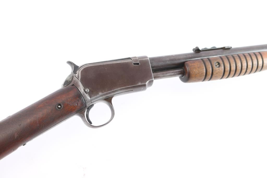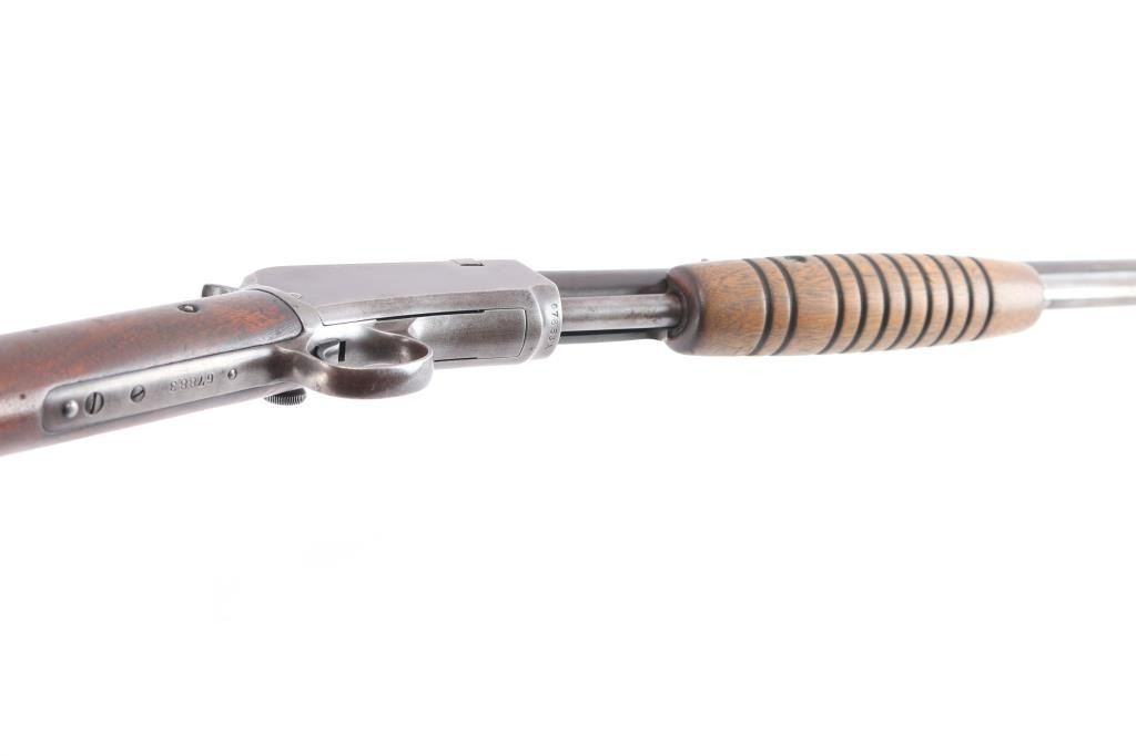 Winchester slide action rimfire rifle manufactured circa 1938. It has a 23" blued barrel and receiver, dovetailed blade with bead front sight, adjustable sporter rear sight, 3/4 length magazine tube, smooth curved trigger, checkered hammer spur, and knurled takedown screw on the left of the receiver. Two piece wood stocks are a smooth straight shoulder stock, and a grooved slide handle. The wood buttstock is in very good condition showing normal handling wear, and has plastic checkered buttplate with Winchester logo. The slide handle is also in very good condition. Bore is very good and bright, with rifling, action is smooth. The blued finish is about 60% with the barrel, receiver, and tangs showing a brown patina from handling and age, some minor scratches, and a small dent on the magazine tube.