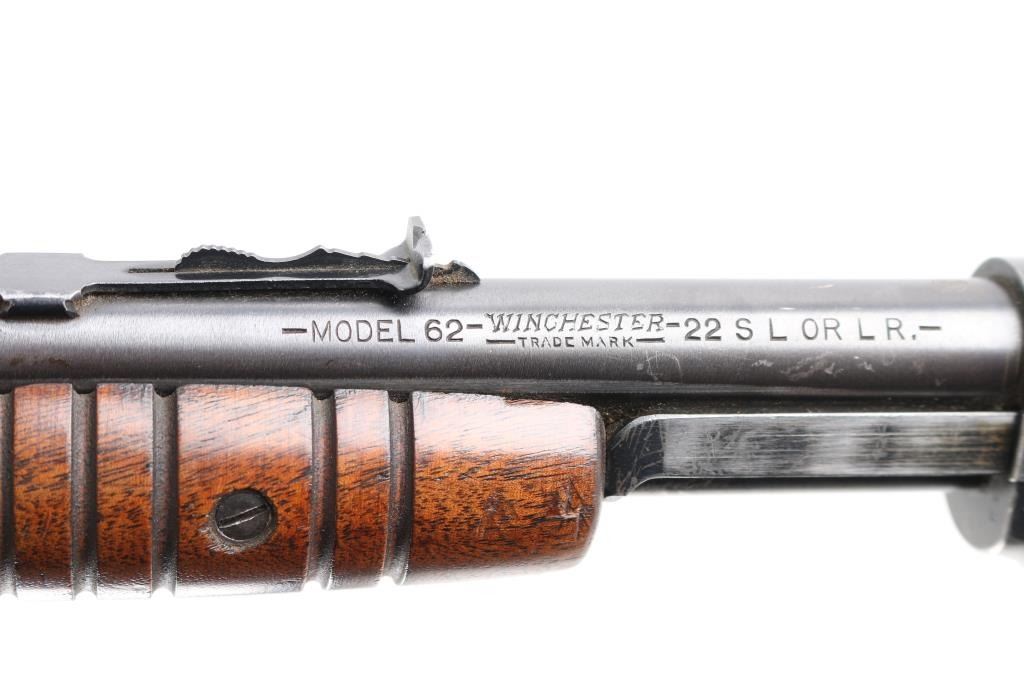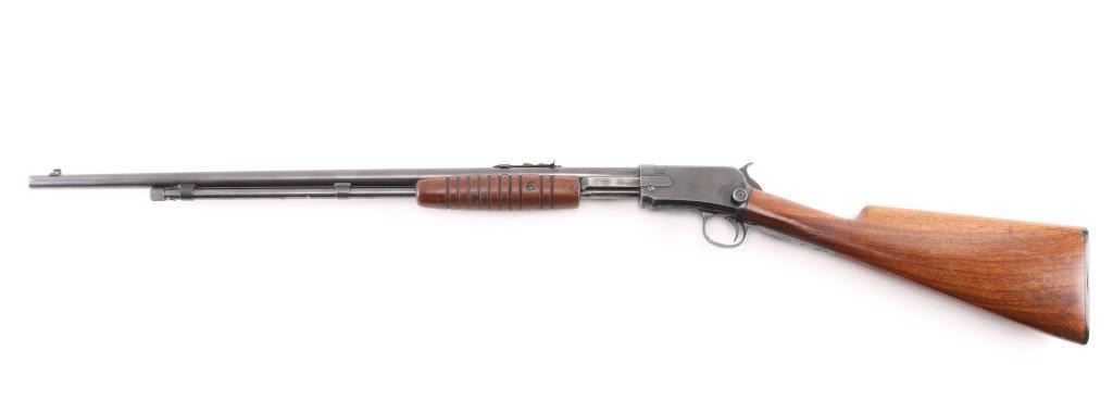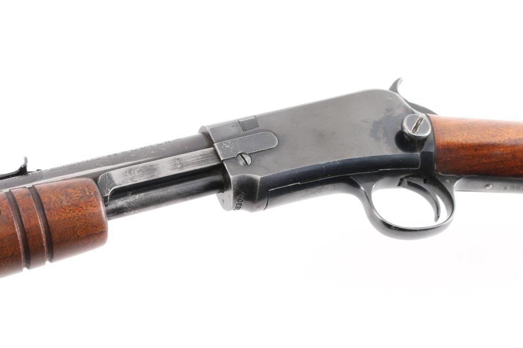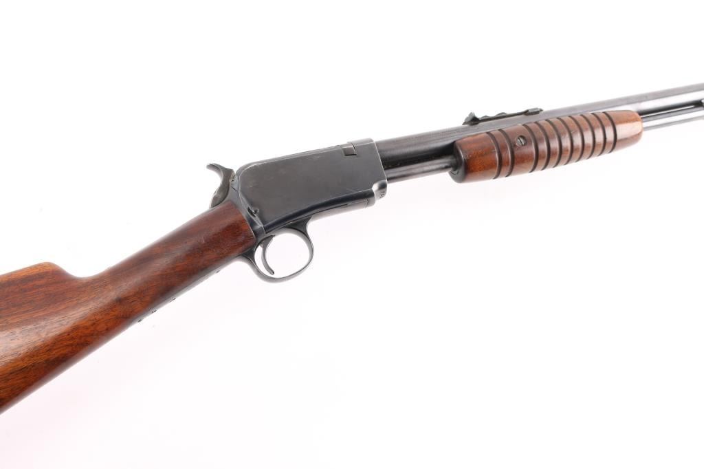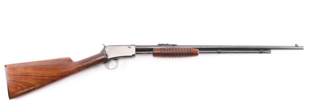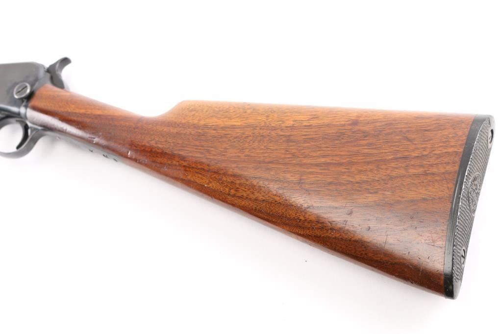 Vintage take down pump action rimfire rifle manufactured circa 1939. Features blued finish, straight gripped smooth walnut stock & grooved pump handle, 23" barrel, blade front & sporting rear sights, 3/4 length magazine tube under barrel, exposed hammer, takedown screw on left side of receiver. Bore is very good condition. Retains 70% blue, thinning or bare metal on moving parts and on edges, some color fading or discoloration, markings are crisp. Wood is very good condition, varnished, with many small dents. Trigger assembly numbered "93830" on lower tang.