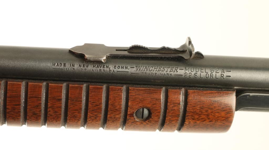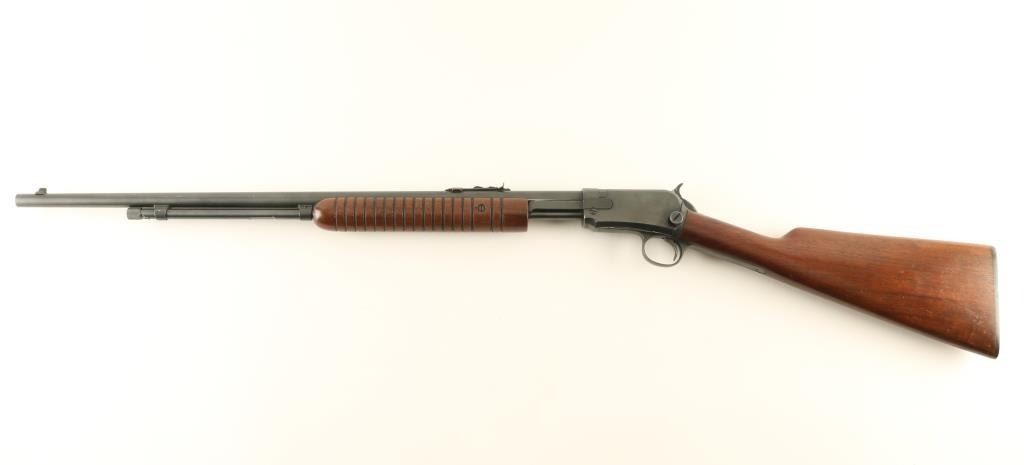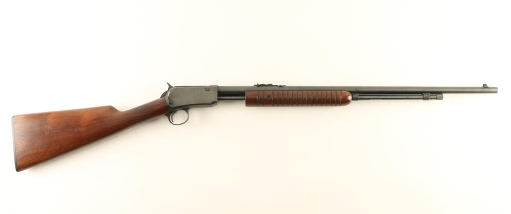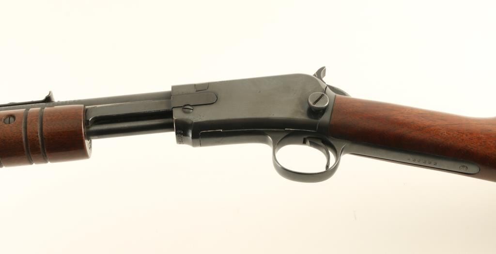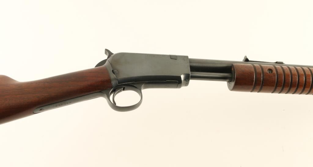 Pump action rimfire rifle manufactured circa 1948. Features blued finish, grooved wood pump handle, wood butt with straight grip area, flat plastic buttplate, 23" barrel, buckhorn sights, magazine tube under barrel, external hammer, take down screw in receiver. Bore is very good to excellent condition, with evidence of being re-sleeved. Retains 90% high polish blue, dark colored, with bare metal on some sharp edges and where pump handle rubs on mag tube, scratches on receiver and mid-barrel. Letters on barrel retain sharp edges; numbers on lower tang are partially eroded across the top of most numbers. Wood is very good condition with small scuffs & dents in many places. Numbers match on receiver cover & lower tang. Condition is NRA Very Good ++ (reworked) *** C&R Firearm ***