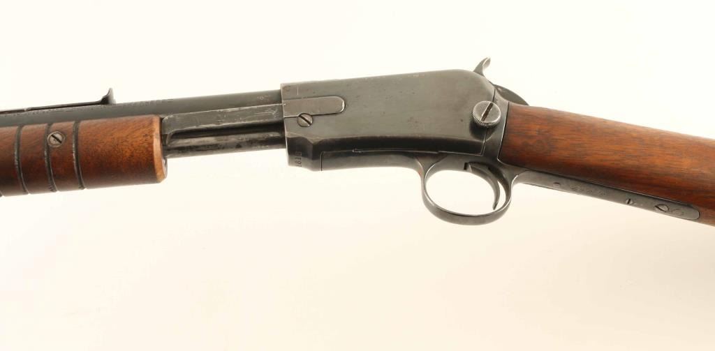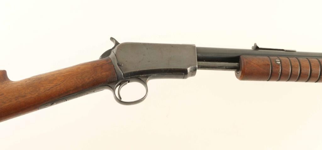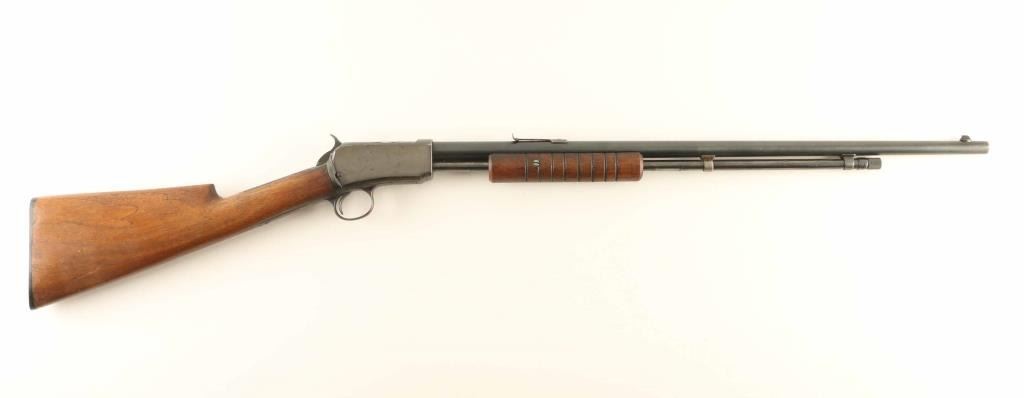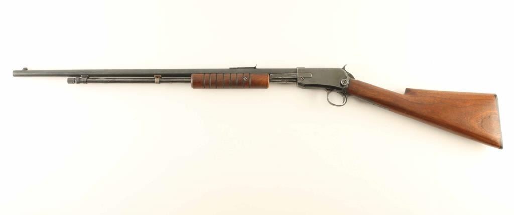 Pump action rimfire rifle manufactured circa 1937. Features 23" barrel, adjustable buckhorn style sights, magazine tube under barrel, exposed hammer, wood furniture, flat plastic buttplate. Bore is very good condition. Metal surfaces are covered by 80% re-blue over previously cleaned pitting, with bare metal on magazine tube, action bar. wood is good to very good condition. Condition is NRA Good as refinished *** C&R Firearm ***