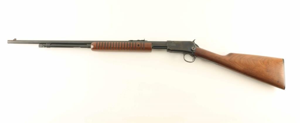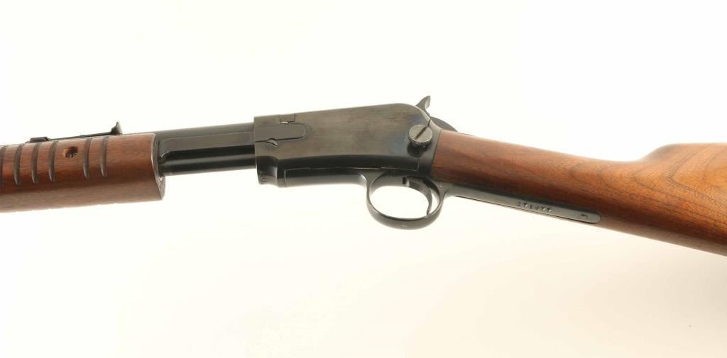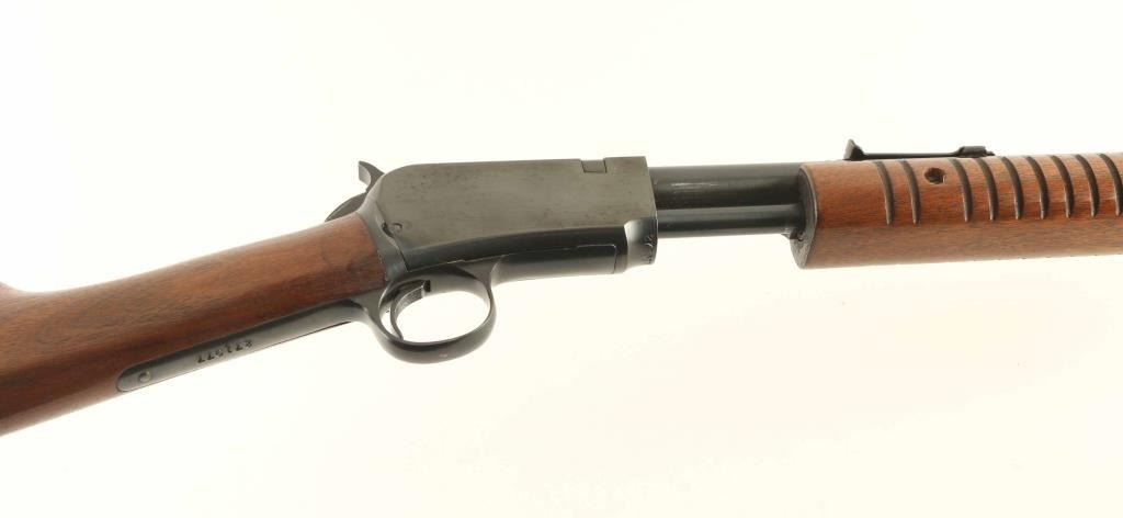 Sn: 271977 Pump action rimfire rifle features blued finish, wood stock & pump handle, 23" barrel, magazine tube under barrel, adjustable sights, external hammer, takedown screw on left side of receiver. Bore is excellent condition. Retains 80% deep blue with bare metal at top edges of receiver, where pump handle rubs, areas of patina on barrel near muzzle. Wood is very good condition with scratches and creases, appears to have varnish added to butt. Observed numbers match. Condition is NRA Very Good *** C&R Firearm ***