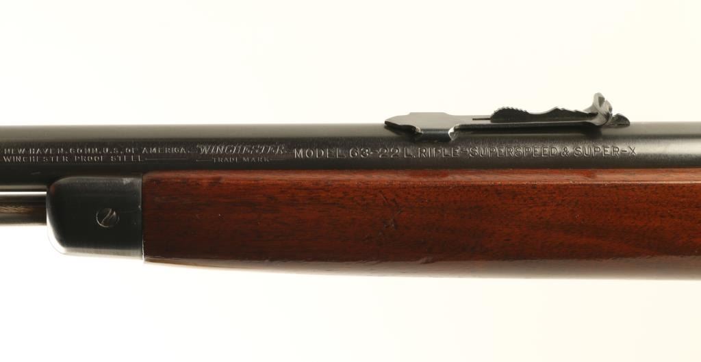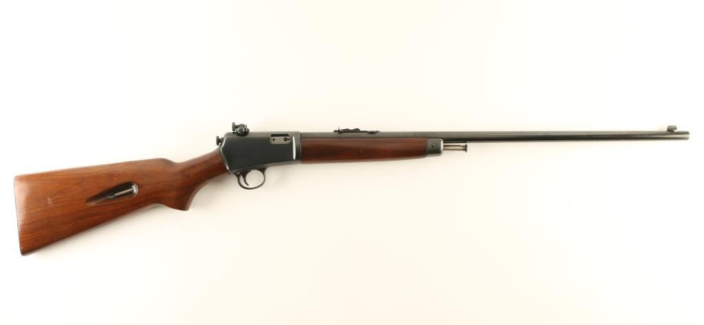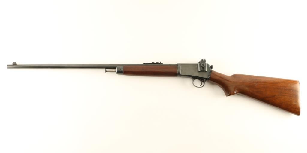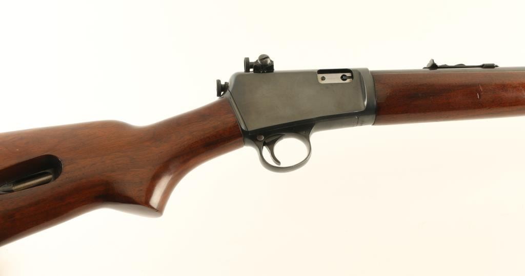Semiautomatic rimfire rifle manufactured circa 1947. Features blued finish, wood forend with steel nose cap, wood butt with curved grip, steel buttplate, 23" barrel, buckhorn type sights, receiver mounted rear peep sight, magazine tube in butt, manual safety, takedown screw at receiver. Bore is very good to excellent condition. Retains 95% refinish with few scratches and scuff marks. Wood is very good to excellent condition with creases & scratches. Numbers match on receiver & cover. Condition is near NRA Excellent *** C&R Firearm ***