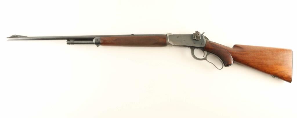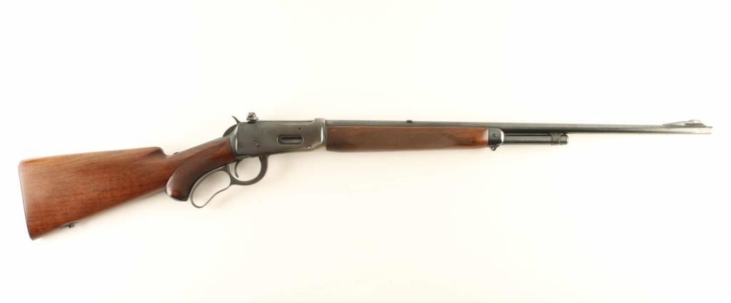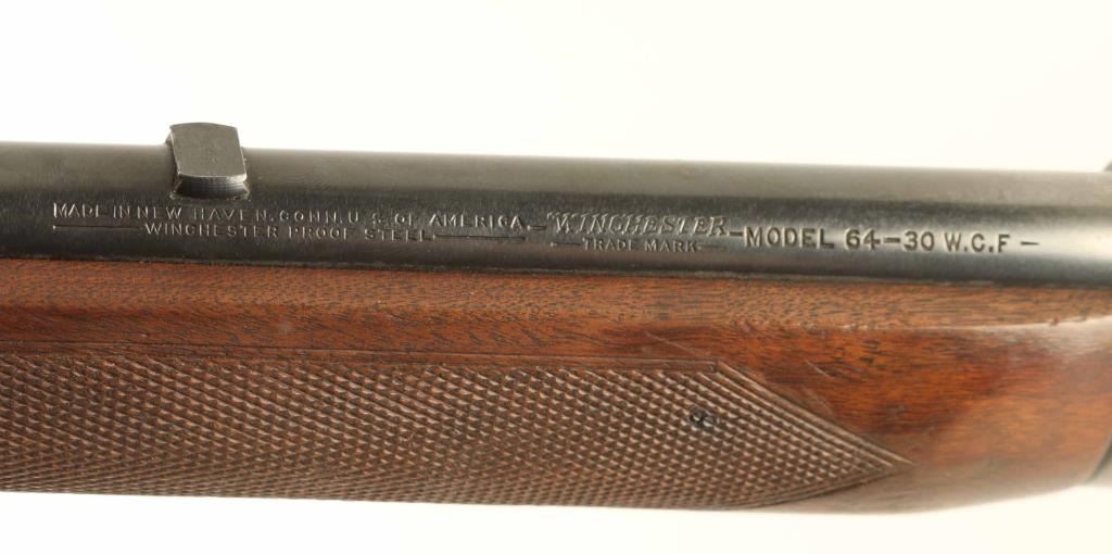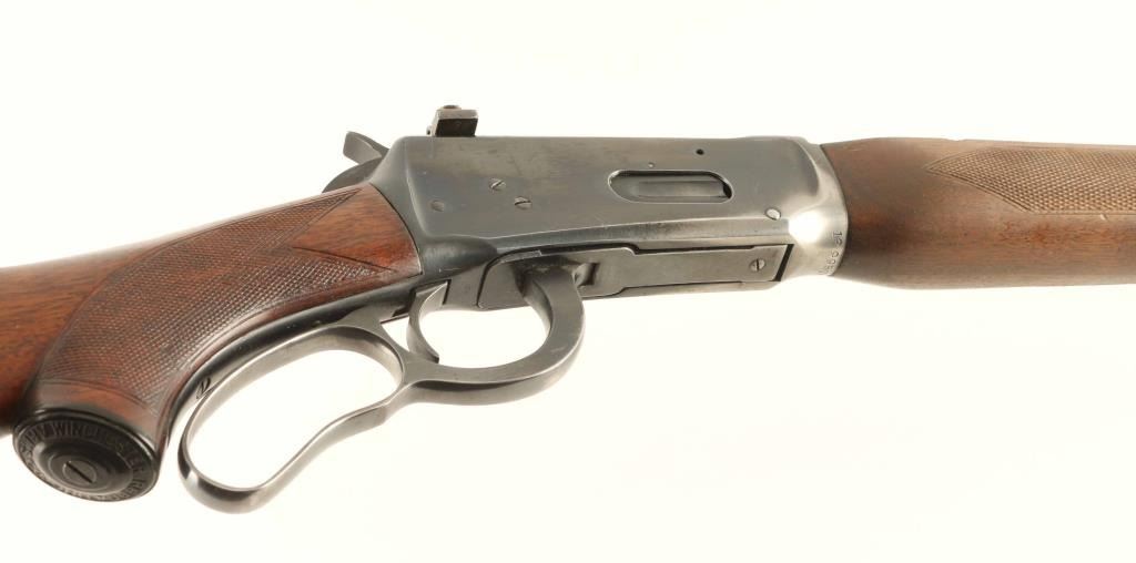 Lever action rifle manufactured circa 1943 to 1948. Features 24" barrel, ramp front sight, rear sight dovetail filled with blank, receiver mounted adjustable rear peep sight, 2/3 length tube magazine under barrel, serrated hammer, curved lever, pistol grip stock, checkered panels at wrist and forend, checkered steel buttplate, European style sling studs at nosecap and butt. Plastic grip cap marked "WINCHESTER REPEATING ARMS CO". Bore is bright with strong rifling, needs cleaning. Retains 80% blued finish with thinning and bare metal at front half of receiver, lever, and muzzle. Wood is good to very good condition, forend appears dark from handling and has several small chips from right side. Letters are sharp. Condition is NRA Good+ *** C&R Firearm ***