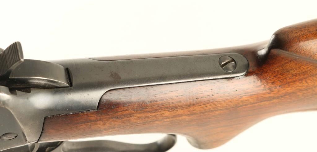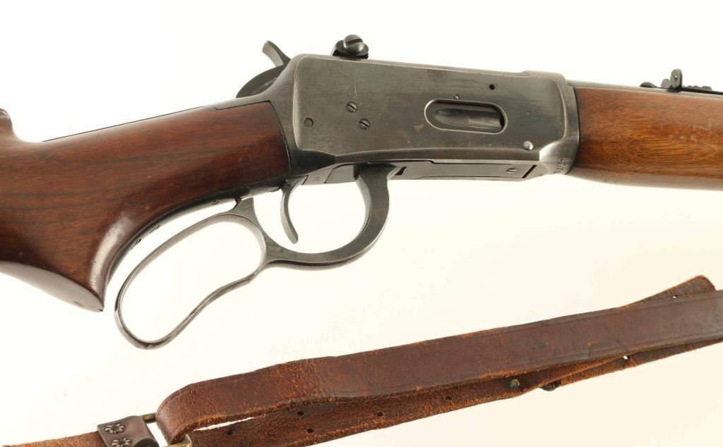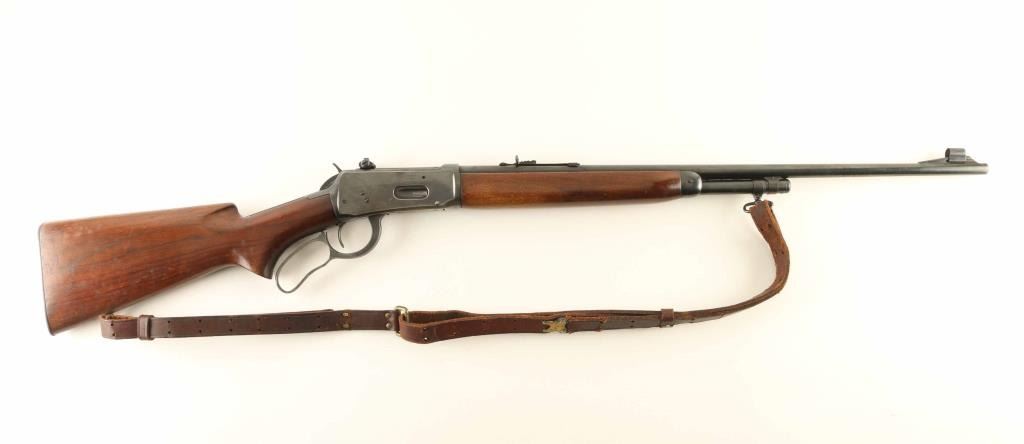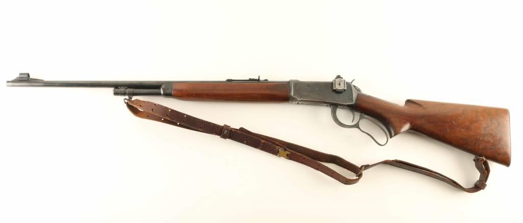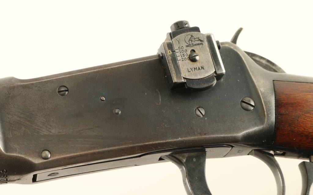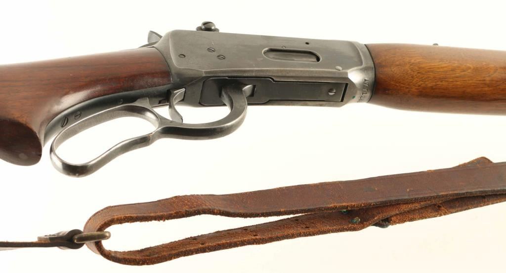 Lever action rifle manufactured circa 1951. Features 24" barrel, 2/3 length magazine, buckhorn sights with hooded blade front sight, receiver mounted Lyman peep rear sight, curved pistol grip, shotgun butt with checkered steel buttplate, sling swivels. Bore is very good condition. Retains 75% blue, thinning and graying on edges and where handled, especially receiver & lever edges. Screw slots are good with very slight marring on some. Wood is very good condition with light scuffing and some dents, good wood to metal fit. Operation is smooth. Markings are sharp. Includes poor to fair condition leather sling. Condition is NRA Very Good *** C&R Firearm ***