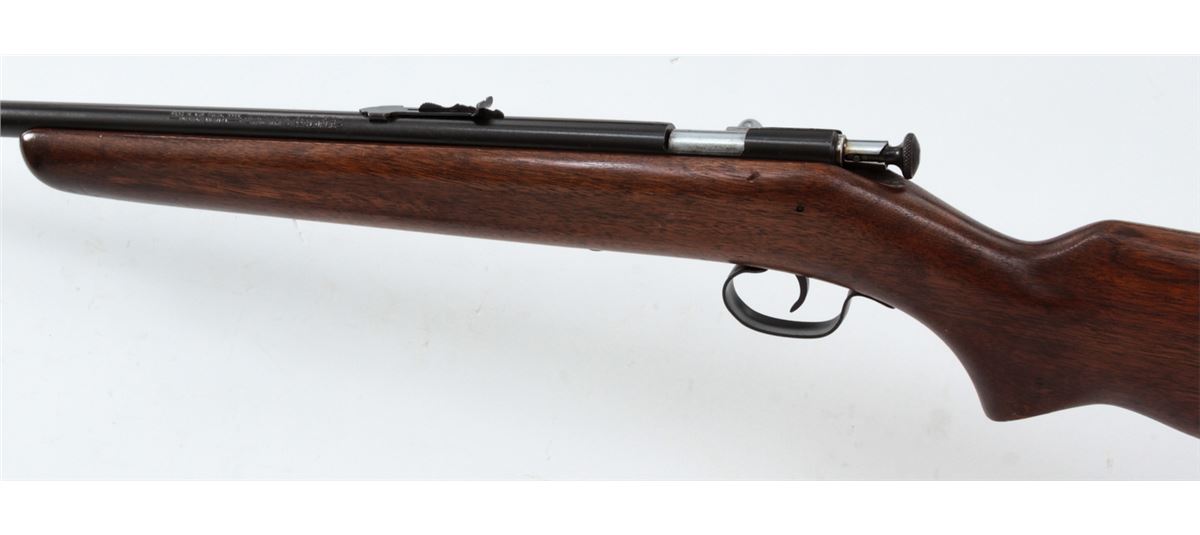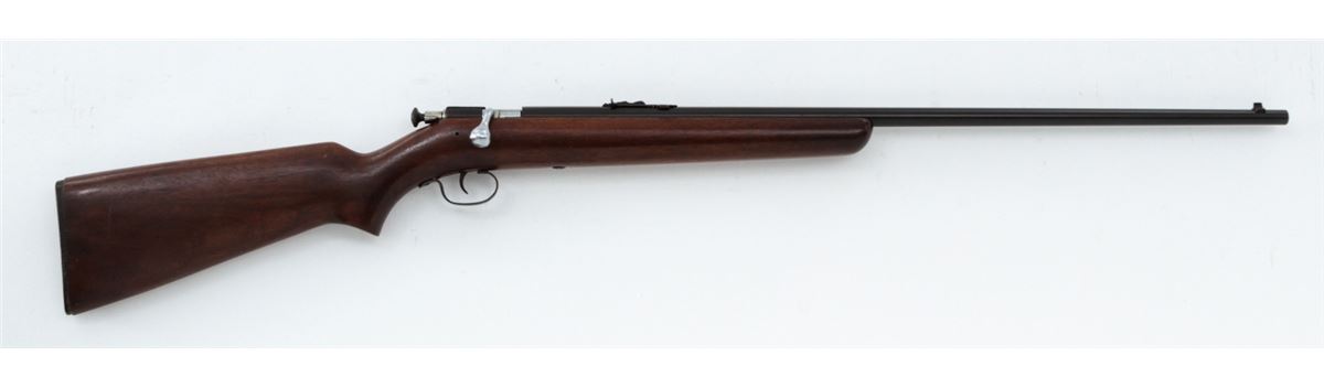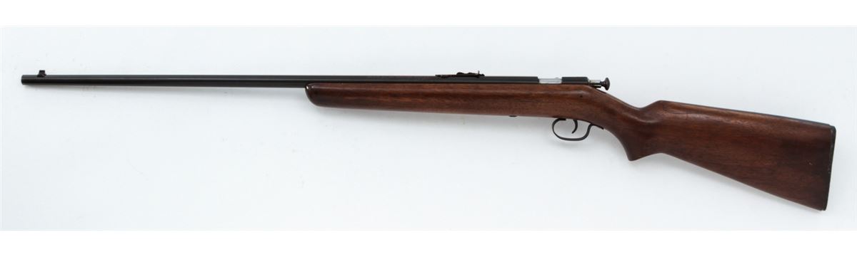 Winchester Model 67A Single Shot Bolt Action Rifle, NVSN, .22 SL/LR cal., 27'' blue barrel, nickel bolt, walnut stock, with factory hard rubber butt pad. Condition is near excellent retaining approx. 97% lightly toning blue. Stock shows light scuffs. Butt pad fits fractionally small. Good action, bright bore, with nice crown. Est.: $150-$300. (C&R)