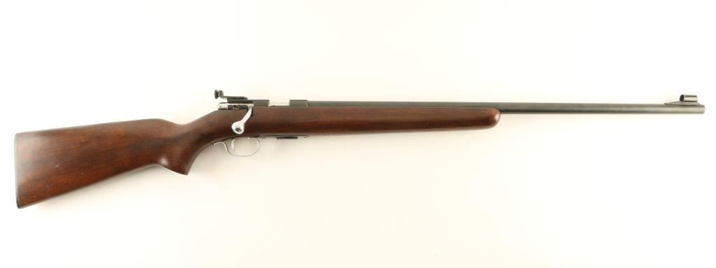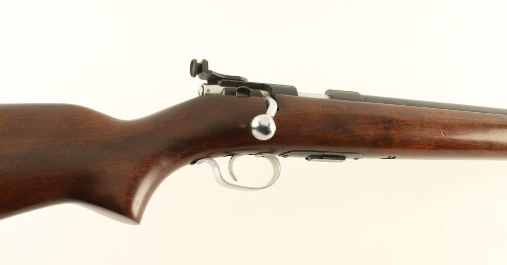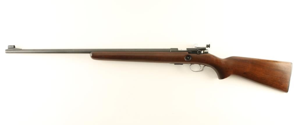 Bolt action rimfire rifle features blued finish (chrome plated trigger, guard, bolt), wood stock with curved grip, flat plastic buttplate, 25" barrel, hooded blade front sight, receiver mounted rear peep sight, detachable magazine with release button in side of stock, manual safety. Bore is excellent condition. Retains 95% blue with some scratches, some bare metal on sharp edges. Chrome plated parts are very good condition with no observed peeling or flaking, Stock is near excellent with few dents & dings. Includes (1) magazine. Condition is NRA Excellent *** C&R Firearm ***