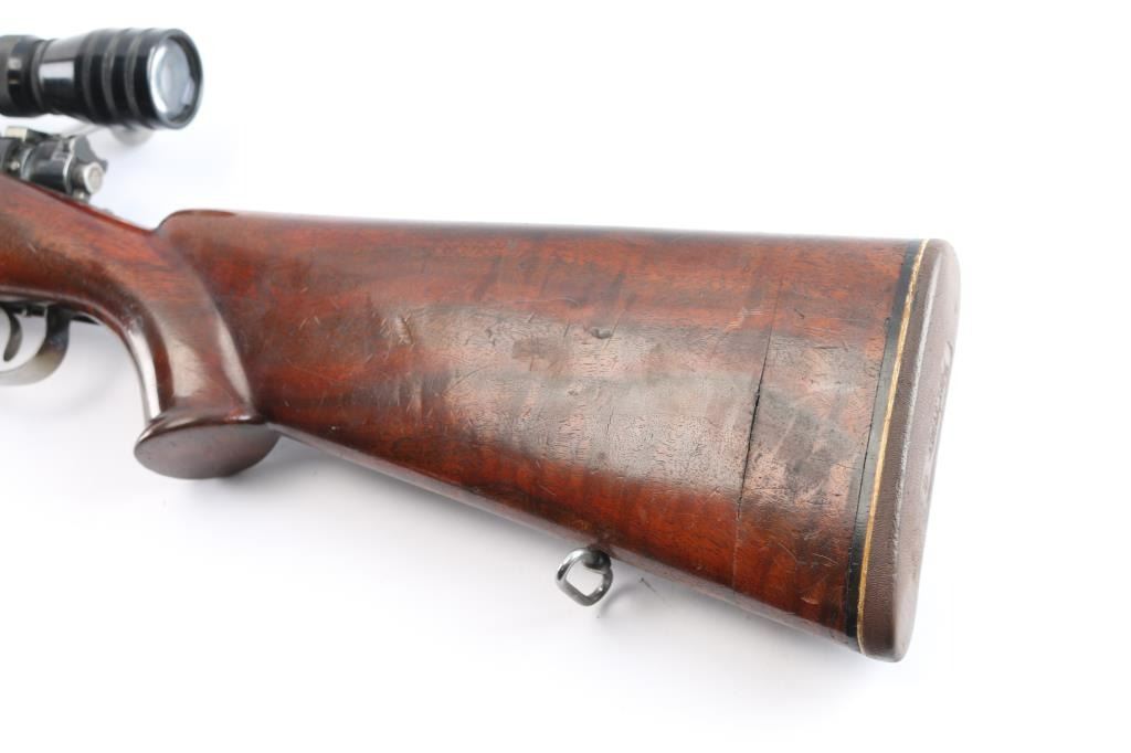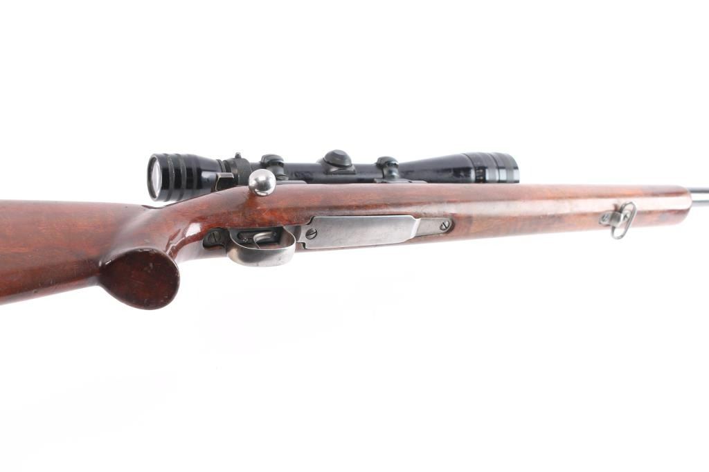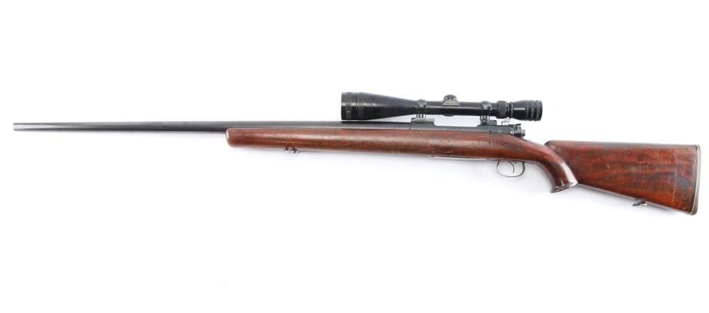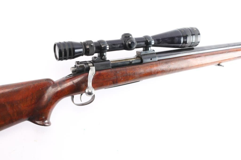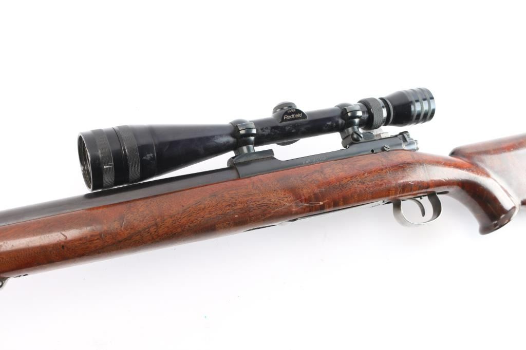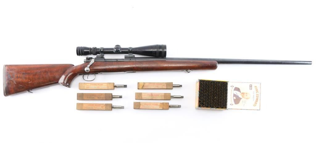 This is a pre-64 Winchester Model 70 that has been rebarreled in 22-243 Middlestead. Serial number dates to 1941. 30" heavy barrel with no provisions for sights, Mauser style safety, restocked with a smooth one piece stock with semi-beavertail forearm, flared grip, thin Pachmayr butt pad, sling swivels. The stock appears to have been lengthened by adding a 2" piece of wood to it, the bolt handle has been shaved down making it thinner. These modifications appear to have been done some time ago. Barrel marked "22-243 Midd." Mounted with a vintage Redfield 6X-18X scope with fine crosshair with target circle, clear view, Redfield bases and rings. Bore is very good/bright, blue on barrel 7 receiver is about 92% with minor scratches/rubs, the bottom metal, triggerguard are in the white from handling, the action is smooth and the wood is overall very good/sound with scratches, minor dings. Comes with a old note to the owner written of stationary from Kenneth Clark, "Specializing in Custom Built Sporting Rifles" which is where he probablely had the work done. Also included are .22-243 M brass weighting 4.7 lbs, box containing .22-243 M chamber reamers, and various pieces of reloading gear.
