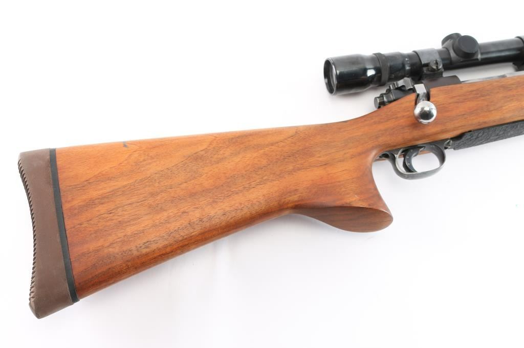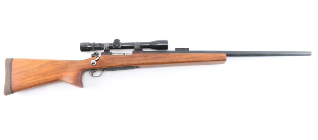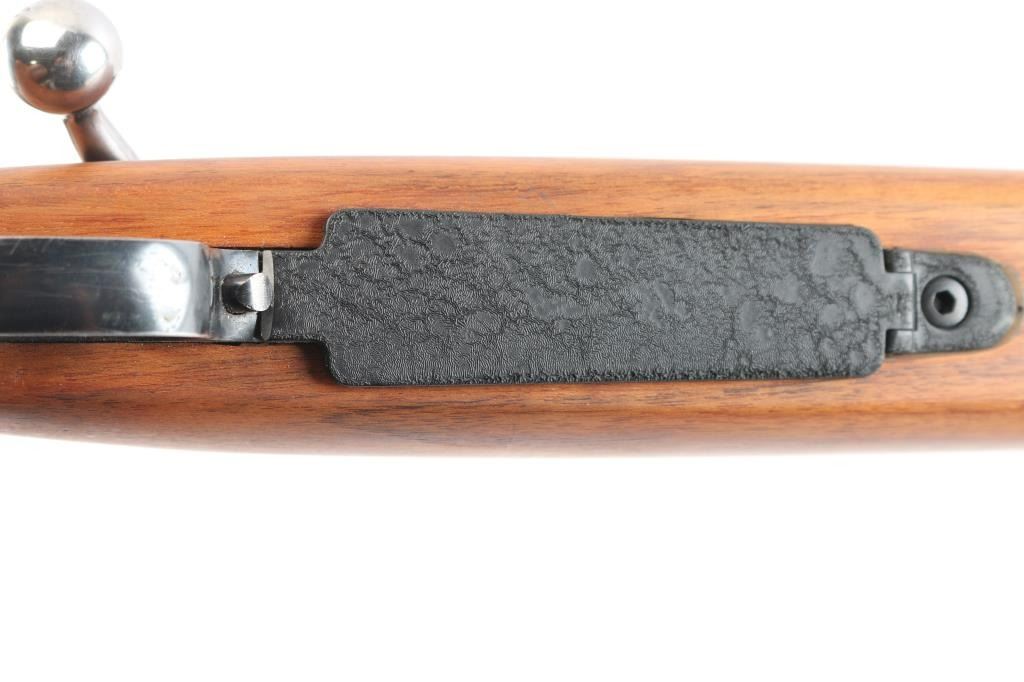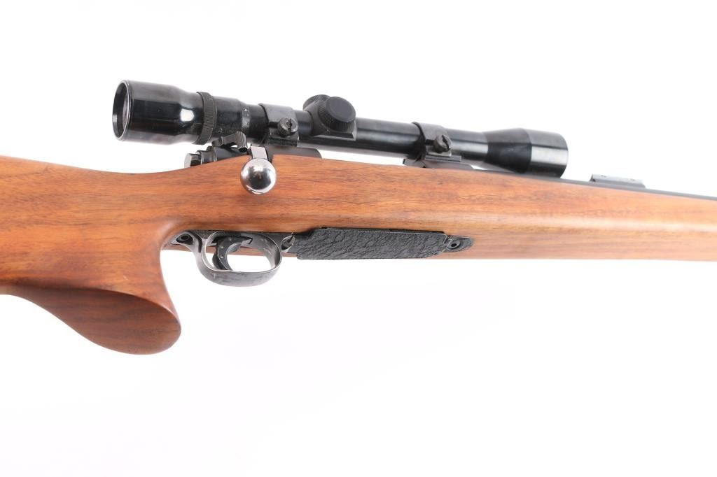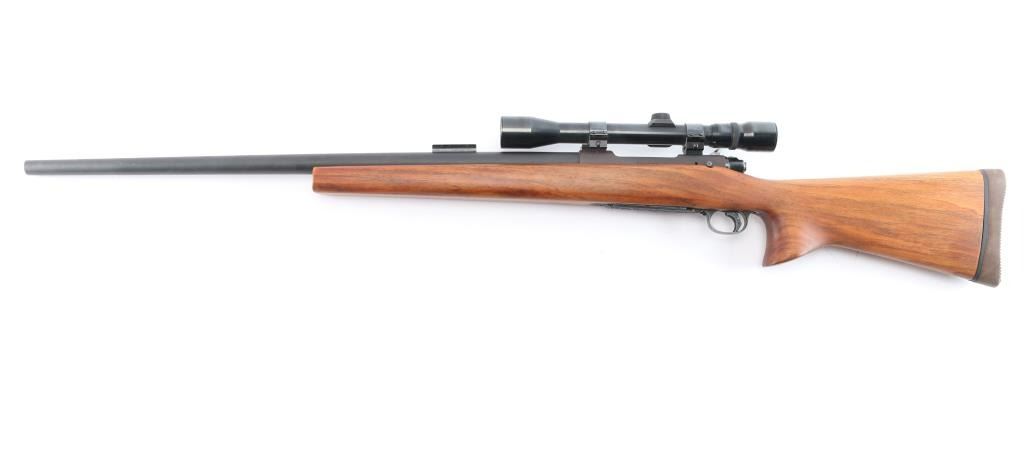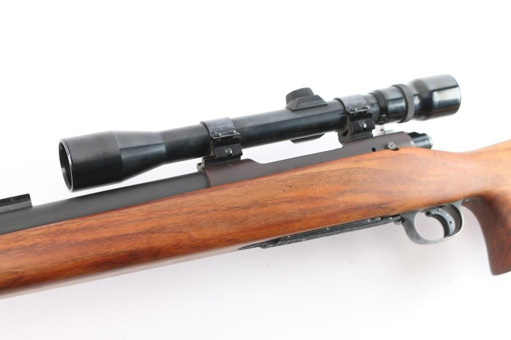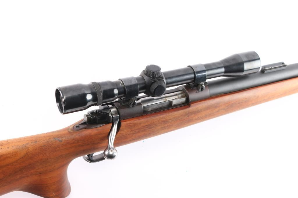 Custom target rifle built on a pre-64 Winchester model 70 action, manufactured 1936. re-barreled with a 27" matte finished heavy barrel chambered in .22-250, 2' sight base installed on the lower end. Mauser style safety, stainless bent bolt handle, hinged floorplate, serrated wide trigger shoe installed. smooth one-piece 'Bench Rest' style stock with 'decelerator' solid rubber recoil pad. Mounted with a weaver 'Marksman' 3x-9x scope, duplex reticle, clear optics, Weaver rings. Bore is excellent/bright, the receiver is a plum color, barrel finish is excellent and the wood is excellent. Friction wear on the bolt/extractor, the floorplate is coated with in a rough textured substance.