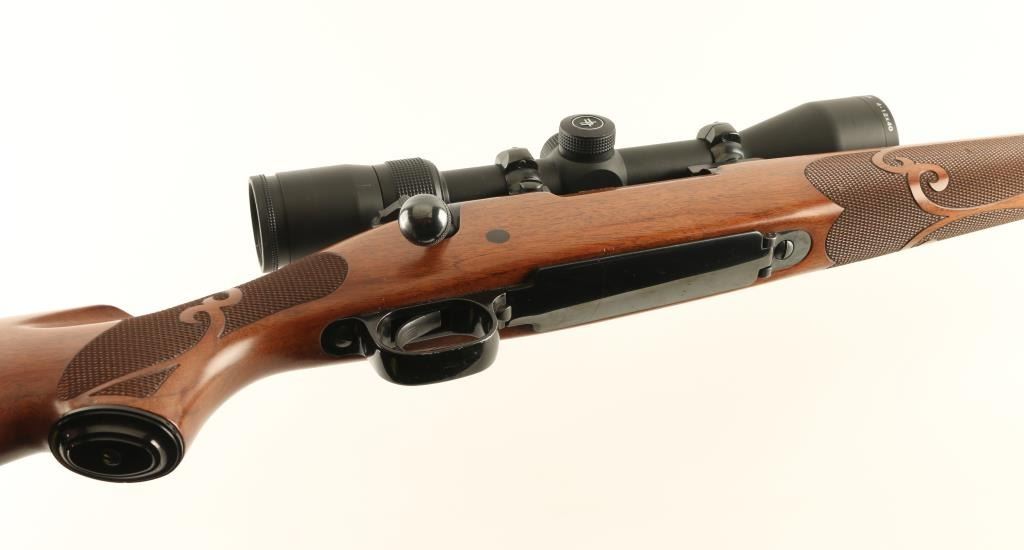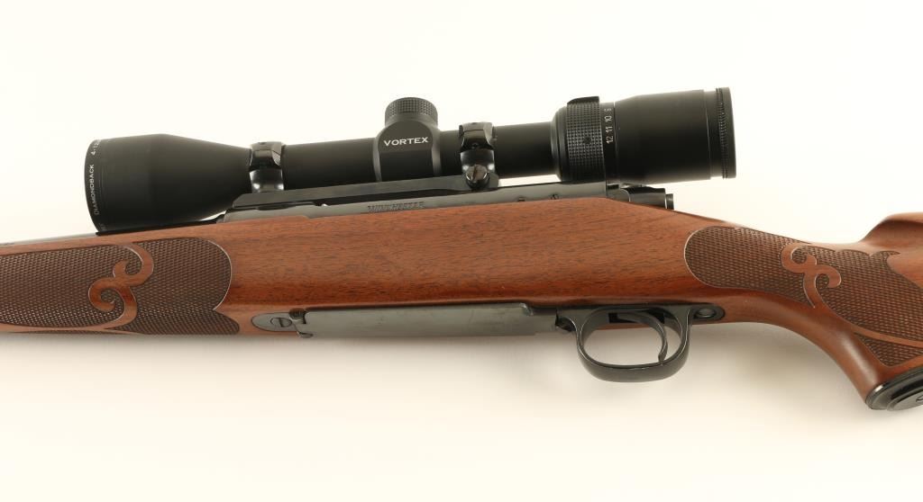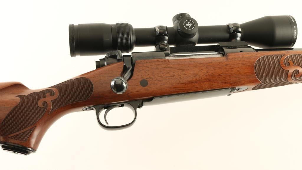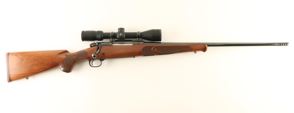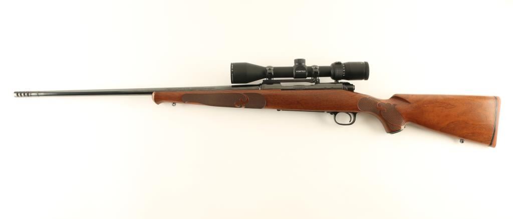 Bolt action rifle features blued finish, wood stock with fancy checkering panels at forend & wrist, solid rubber butt pad, sling studs, schnabel forend tip, no cheekpiece, 22" barrel, no sights, muzzle brake, one piece Redfield scope base, hinged floorplate, manual safety. Bore is very good condition. Retains 95% blue, with few handling marks. Stock is very good to excellent with few dents and scratches. Mounts an excellent condition Vortex Diamondback 4-12x40mm scope with mil-dot reticle, excellent clear view. Condition is NRA Excellent *** Modern Firearm ***