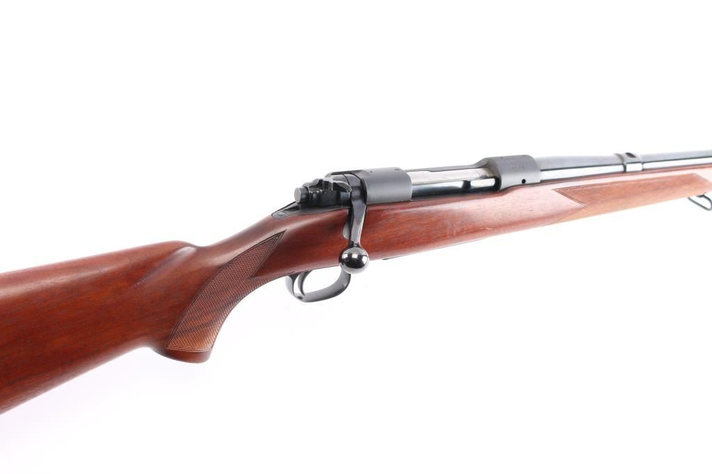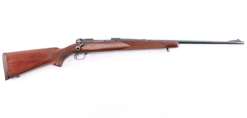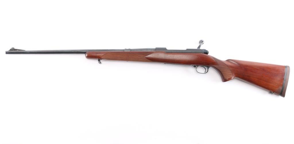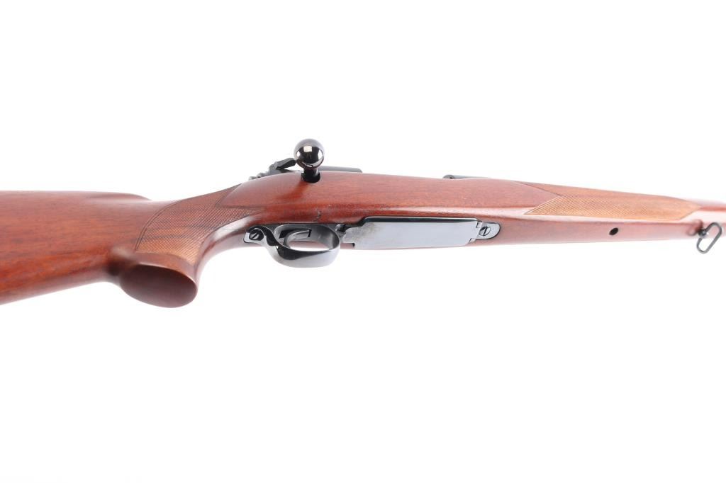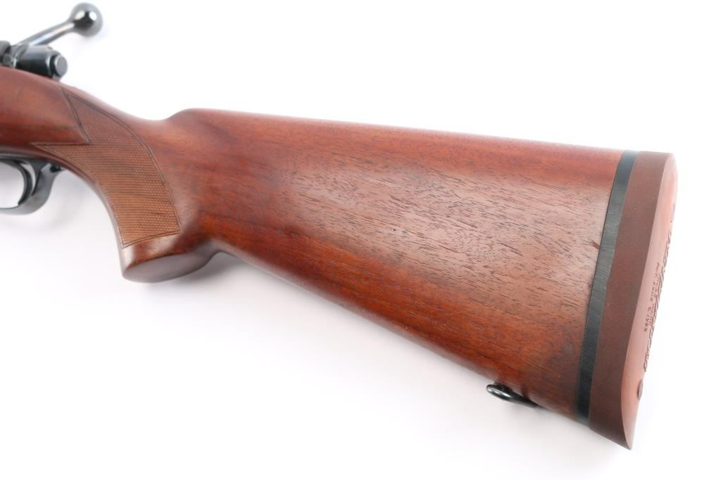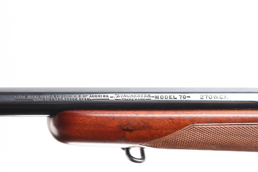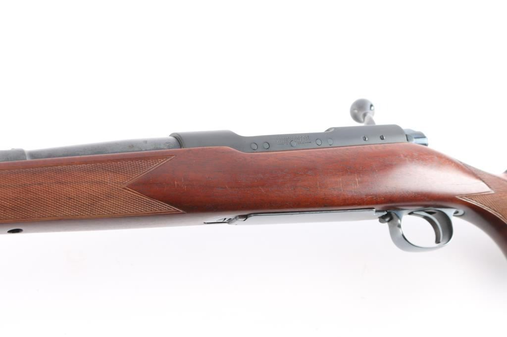 "Pre '64" Vintage bolt action rifle, factory chambered for 270 Winchester, circa 1947. Carefully refinished with proper matte receiver and low sheen stock finish, some signs if heavy polishing along barrel. Features blued finish, 24" barrel, ramped front sight base with blade sight, rear sight dovetail is empty, three position safety, hinged floorplate. Checkered walnut stock without cheek piece, sling swivels, factory red solid recoil pad. Bore is bright. Retains 90% re-finish, visible filled screws in left receiver wall. Stock is very good with handling marks, some oil staining at toe.