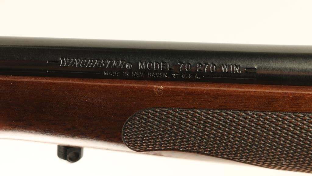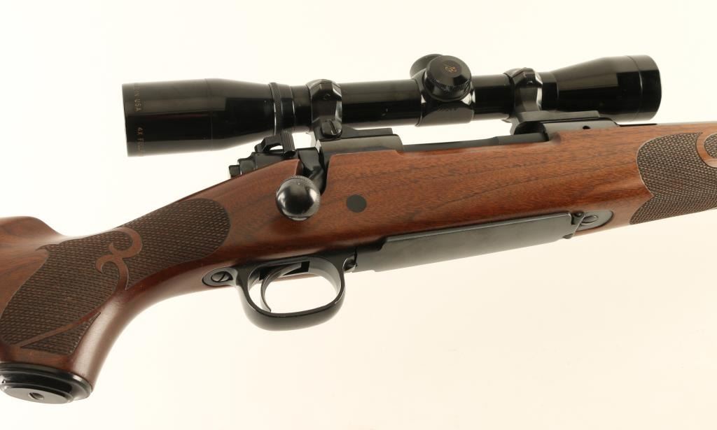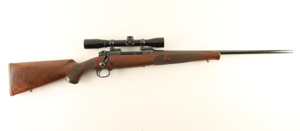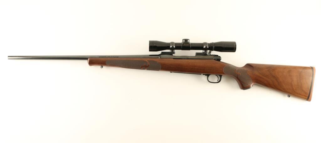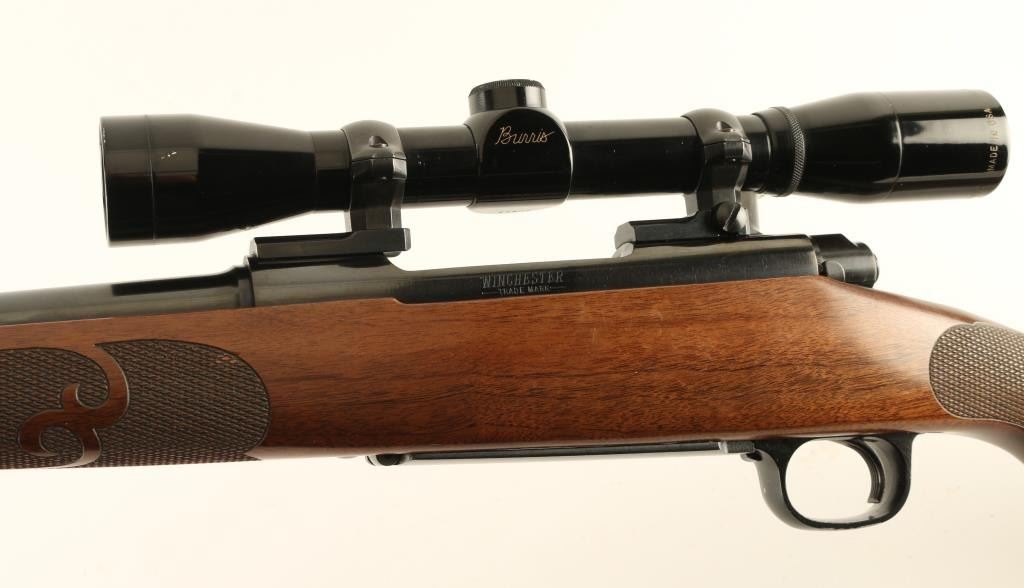 'Classic Featherweight' Bolt action rifle features blued finish, wood stock with fancy checkering panels at forend & wrist, solid rubber butt pad, sling studs, schnabel forend tip, no cheekpiece, 22" barrel, no sights, two piece Redfield type scope base, hinged floorplate, manual safety. Bore is very good condition. Retains 95% blue, with few handling marks. Stock is very good to excellent with few light scuff marks. Mounts a Burris 4x Fullfield scope with duplex reticle, clear view. Condition is NRA Excellent *** Modern Firearm ***